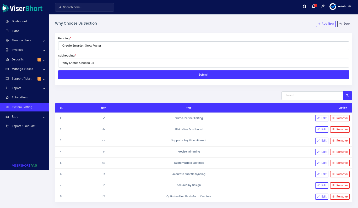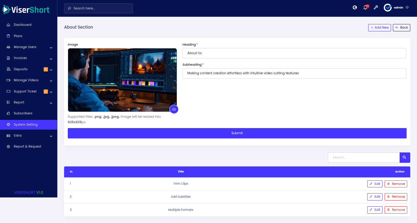 Website integration with APIs of social networks like YouTube, Instagram, TikTok, and Facebook. Website is a tool that saves time, effort, and manual work by letting creators, influencers, and businesses quickly repurpose their video content into short videos and auto-publish them across social platforms. ViserShort supports Bulk uploads. It processes and schedules dozens of clips at once. One video can be adapted for TikTok, YouTube Shorts, Instagram Reels, and more. Our System Support Team collaboration. creators, editors, and managers can work together in one workspace.