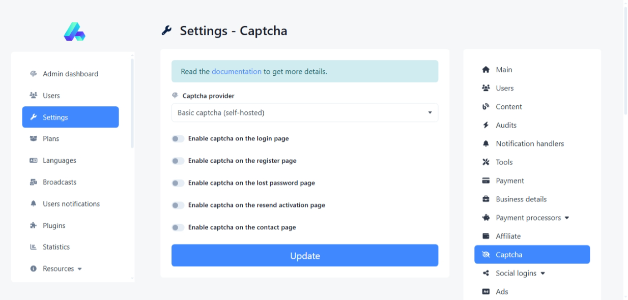 Multiple captcha providers supported: Turnstile, Basic Self-Hosted, reCAPTCHA v2, and hCaptcha.