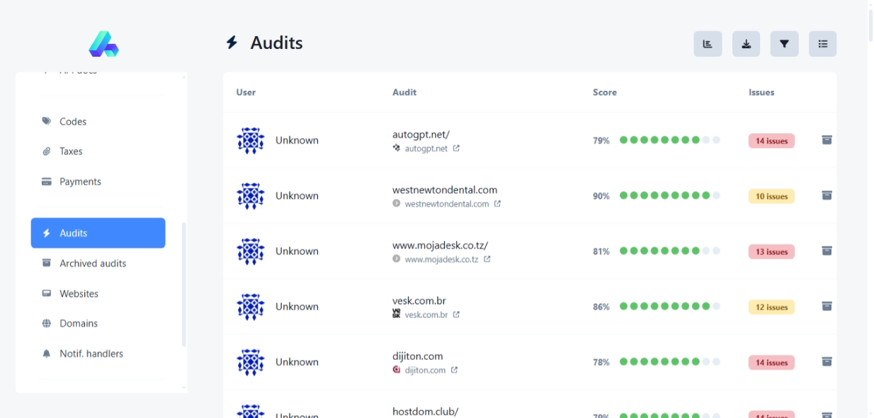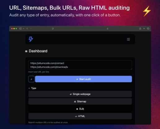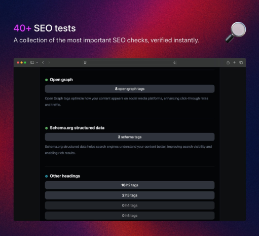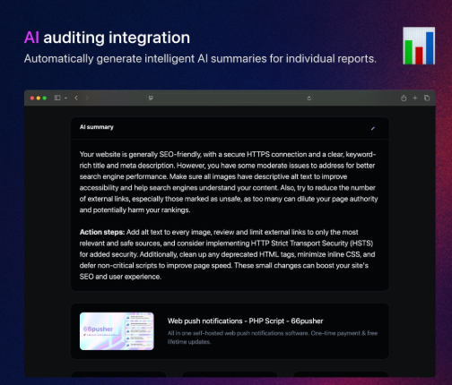 Website is an fully-featured SEO auditing tool with over 40+ SEO tests, scheduled recurring audits, email reports, bulk audits & AI integrations.