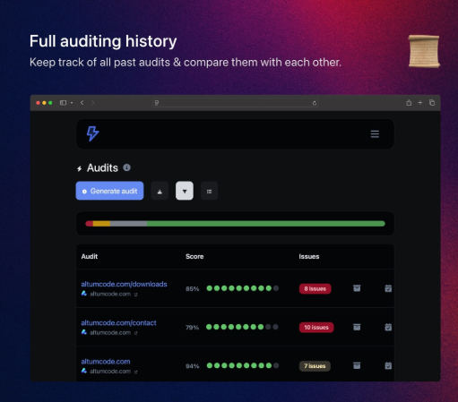 Keep unlimited audit history and archives, then compare results over time to measure SEO improvements.