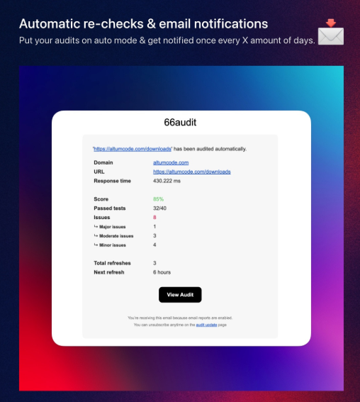 Schedule automated audit re-checks for your URLs and let 66audit monitor them on repeat.