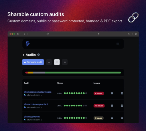 Website is an fully-featured SEO auditing tool with over 40+ SEO tests, scheduled recurring audits, email reports, bulk audits & AI integrations.