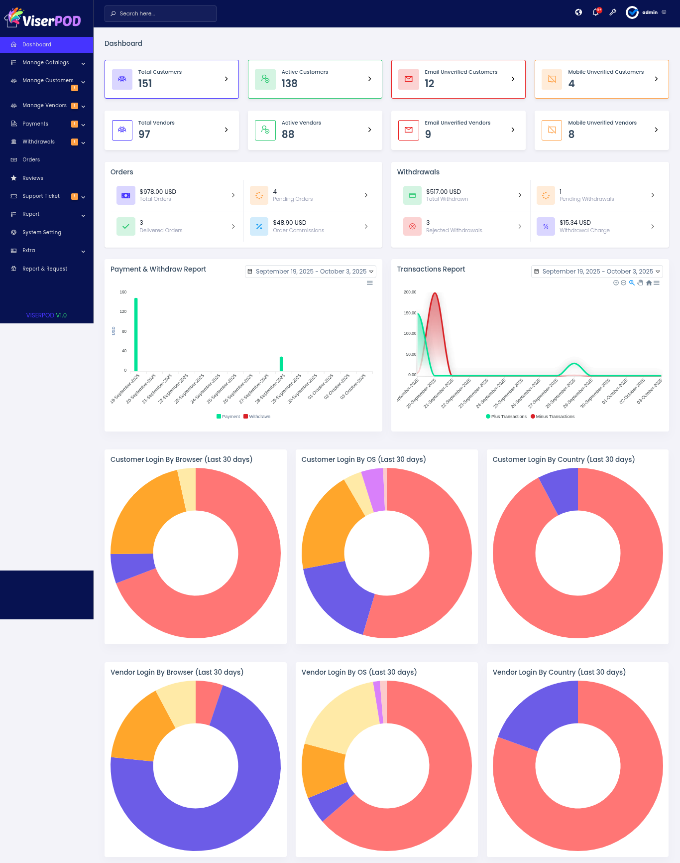 Dedicated panels for customers, vendors, and admin to manage designs, orders, transactions, withdrawals, and reports seamlessly.