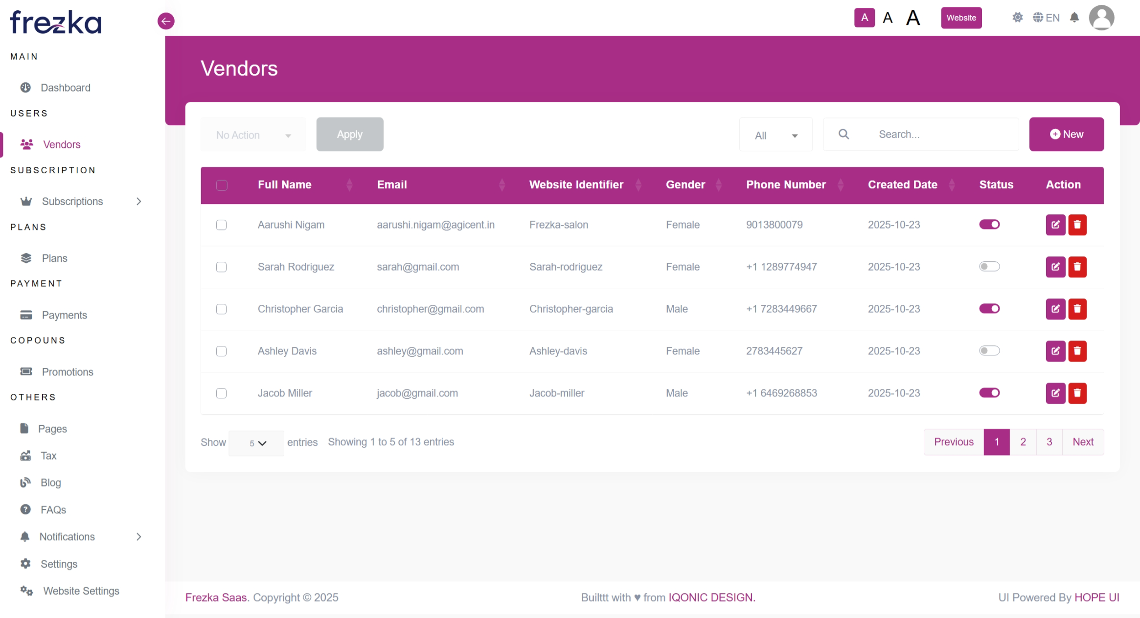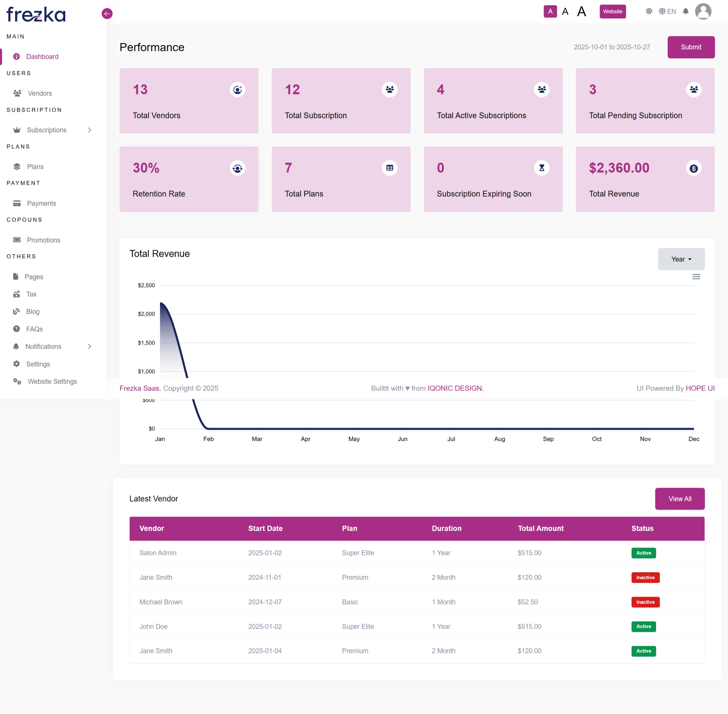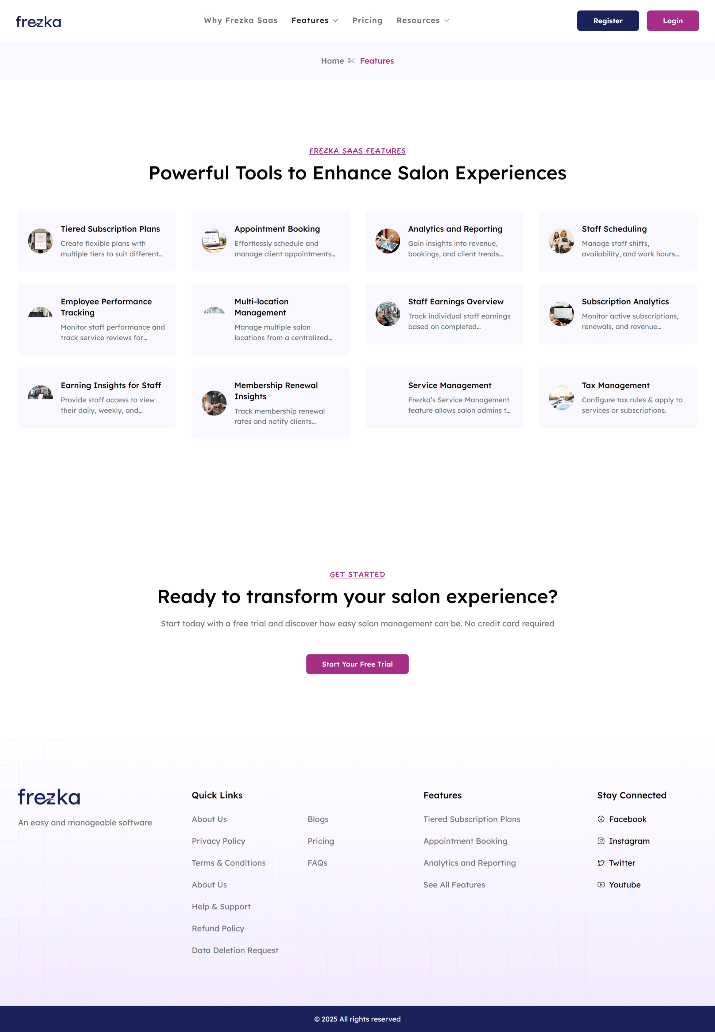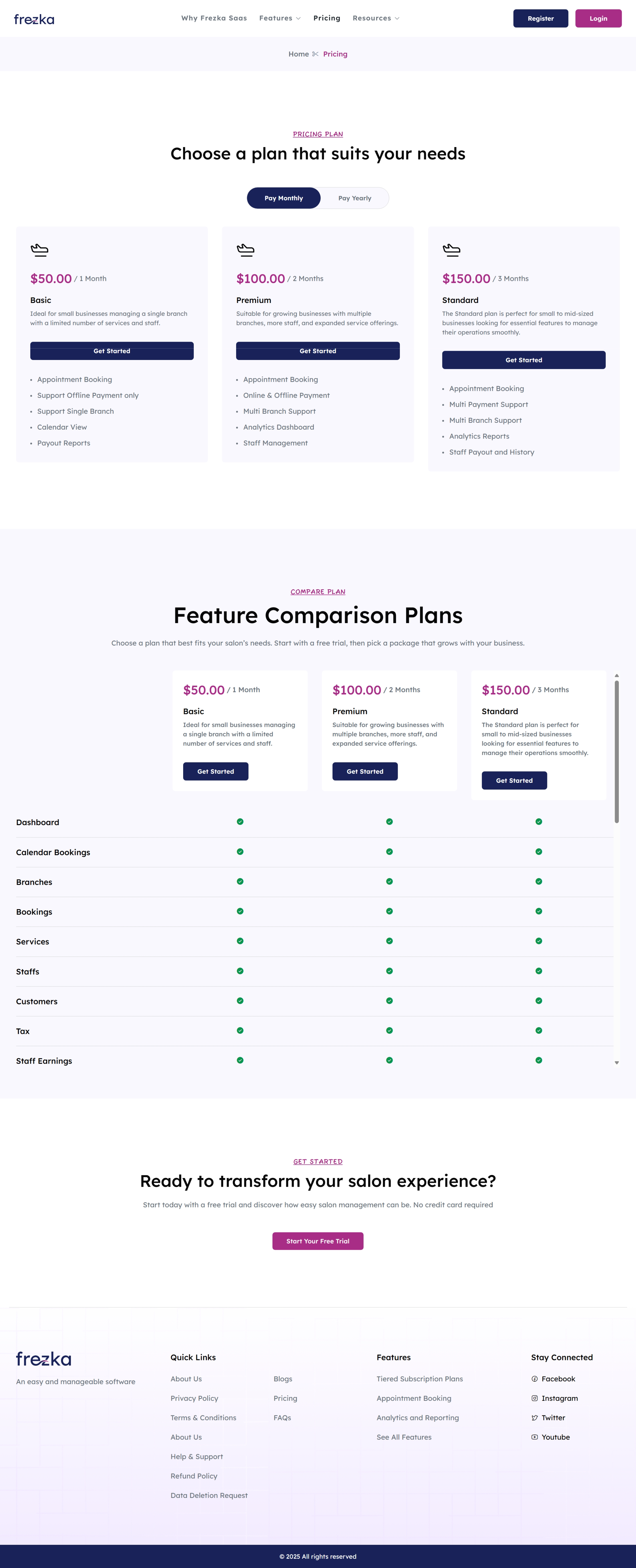 Website is a powerful cloud based SaaS platform designed for salon and spa businesses, offering seamless appointment booking, staff management, and client engagement. Built with Laravel, Frezka SaaS provides a scalable and intuitive solution that helps salon owners automate operations, enhance client experiences, and drive business growth.