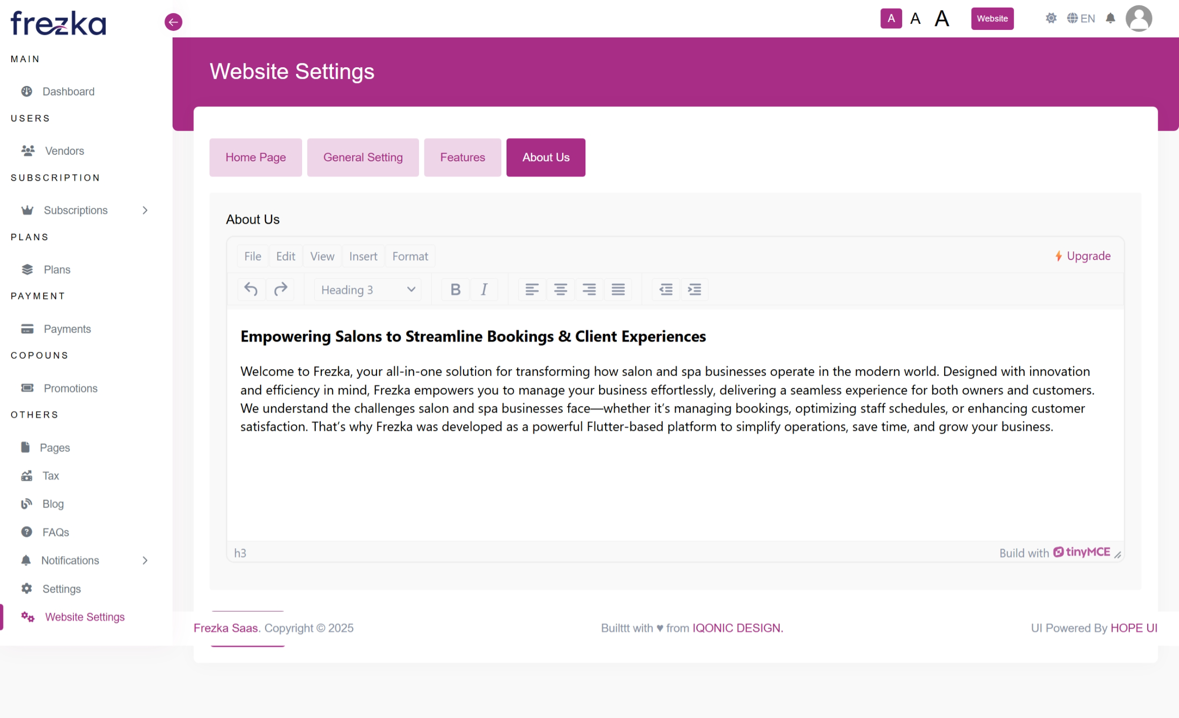 Website is a powerful cloud based SaaS platform designed for salon and spa businesses, offering seamless appointment booking, staff management, and client engagement. Built with Laravel, Frezka SaaS provides a scalable and intuitive solution that helps salon owners automate operations, enhance client experiences, and drive business growth.