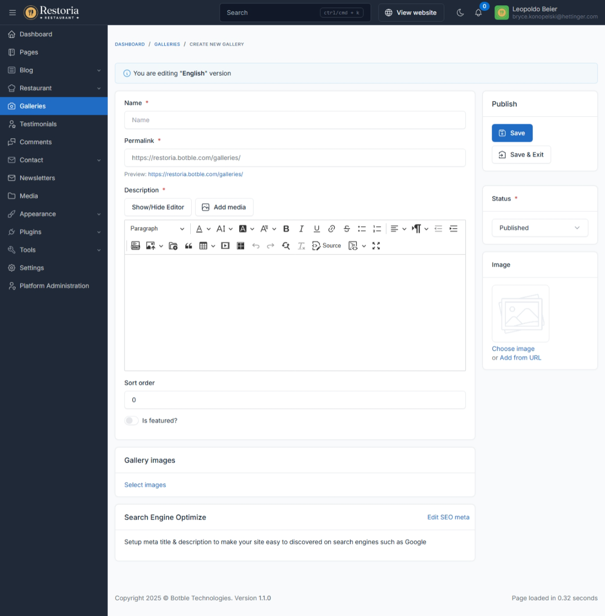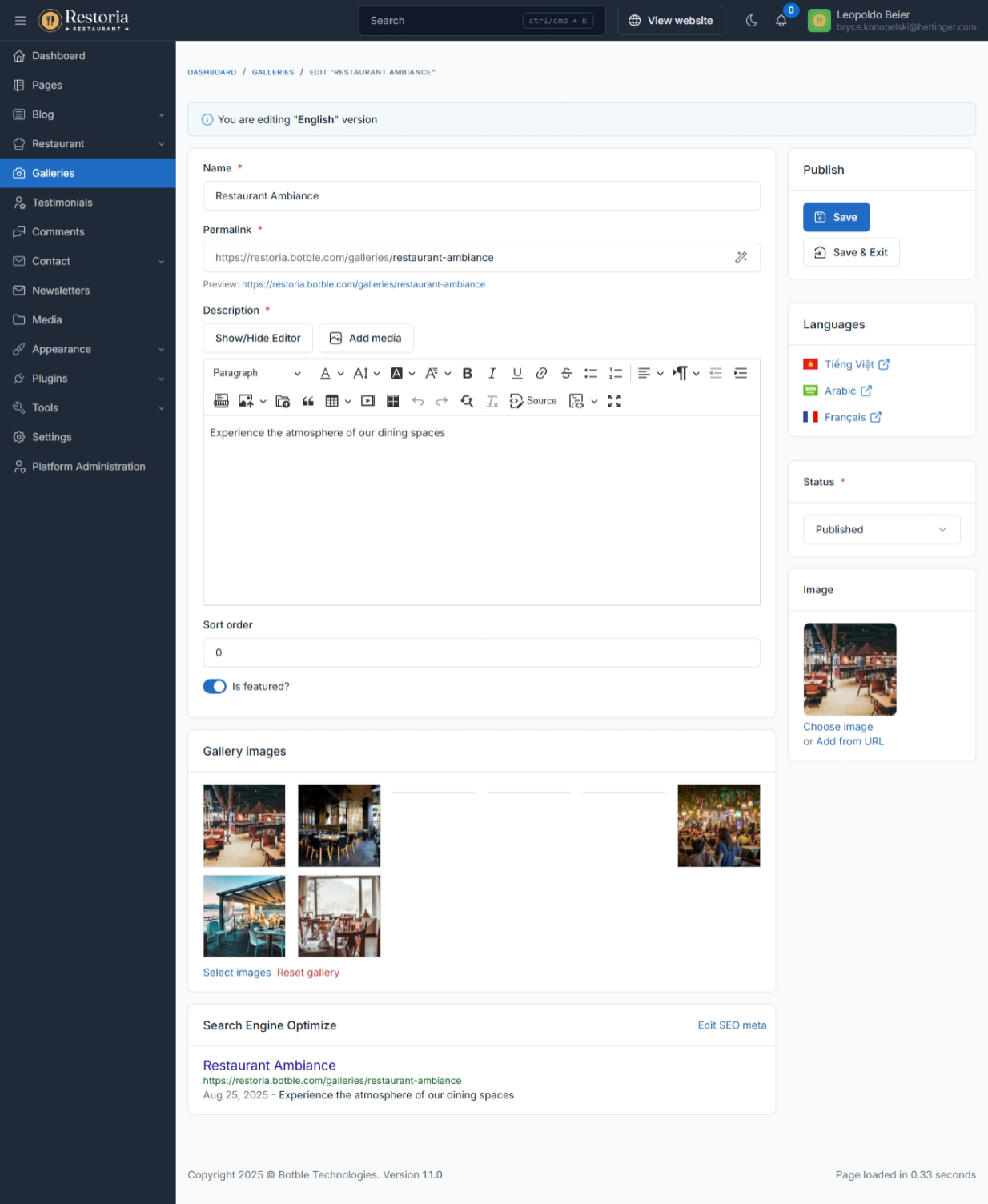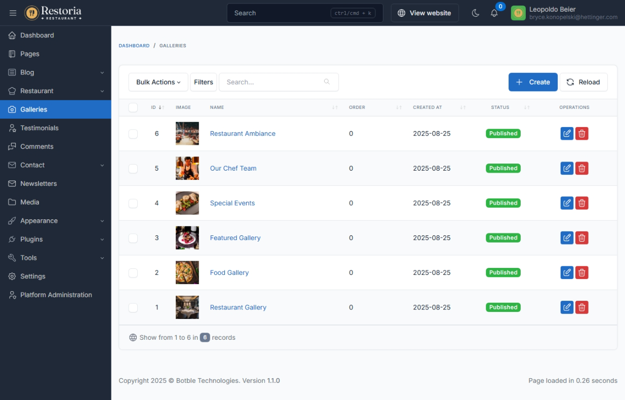 Gallery Sections: Beautiful image galleries to showcase your restaurant ambiance and dishes.