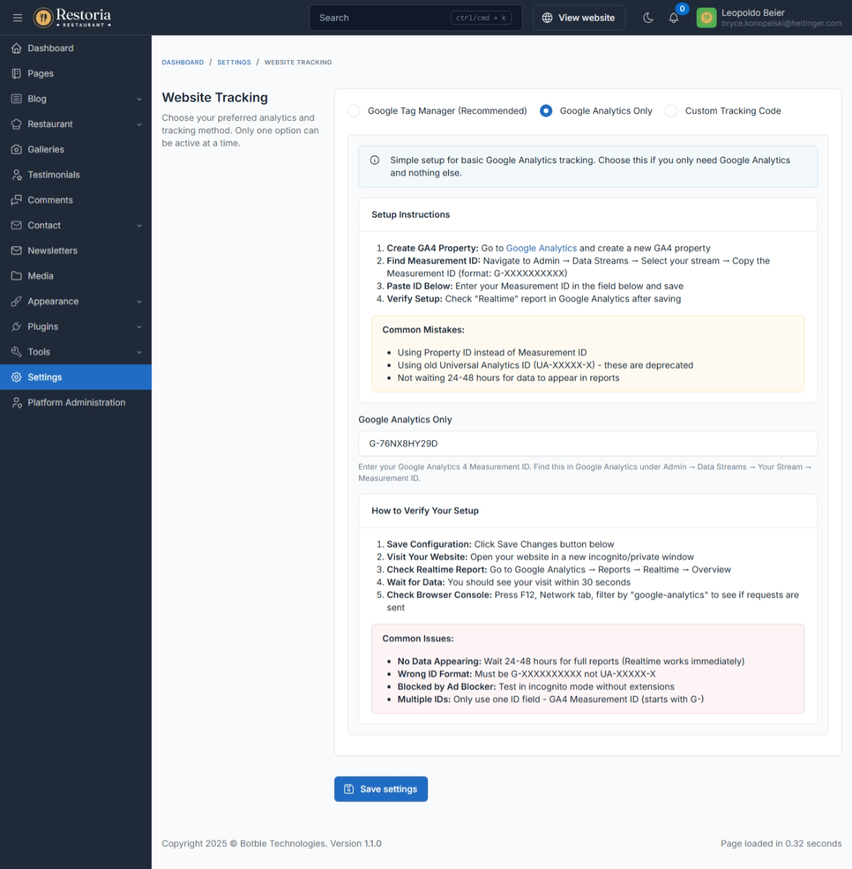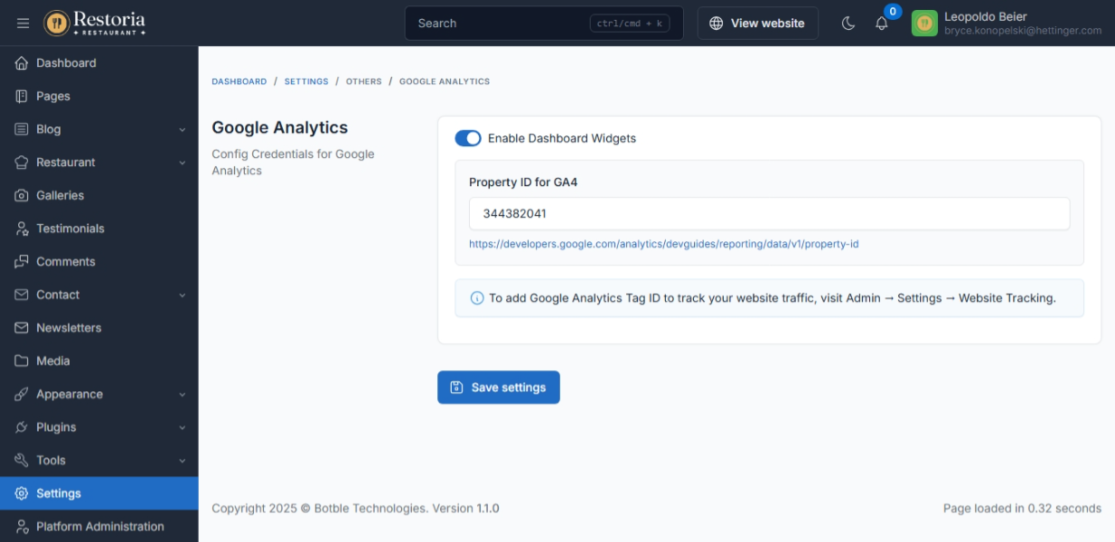 Google Analytics: display analytics data in admin panel.