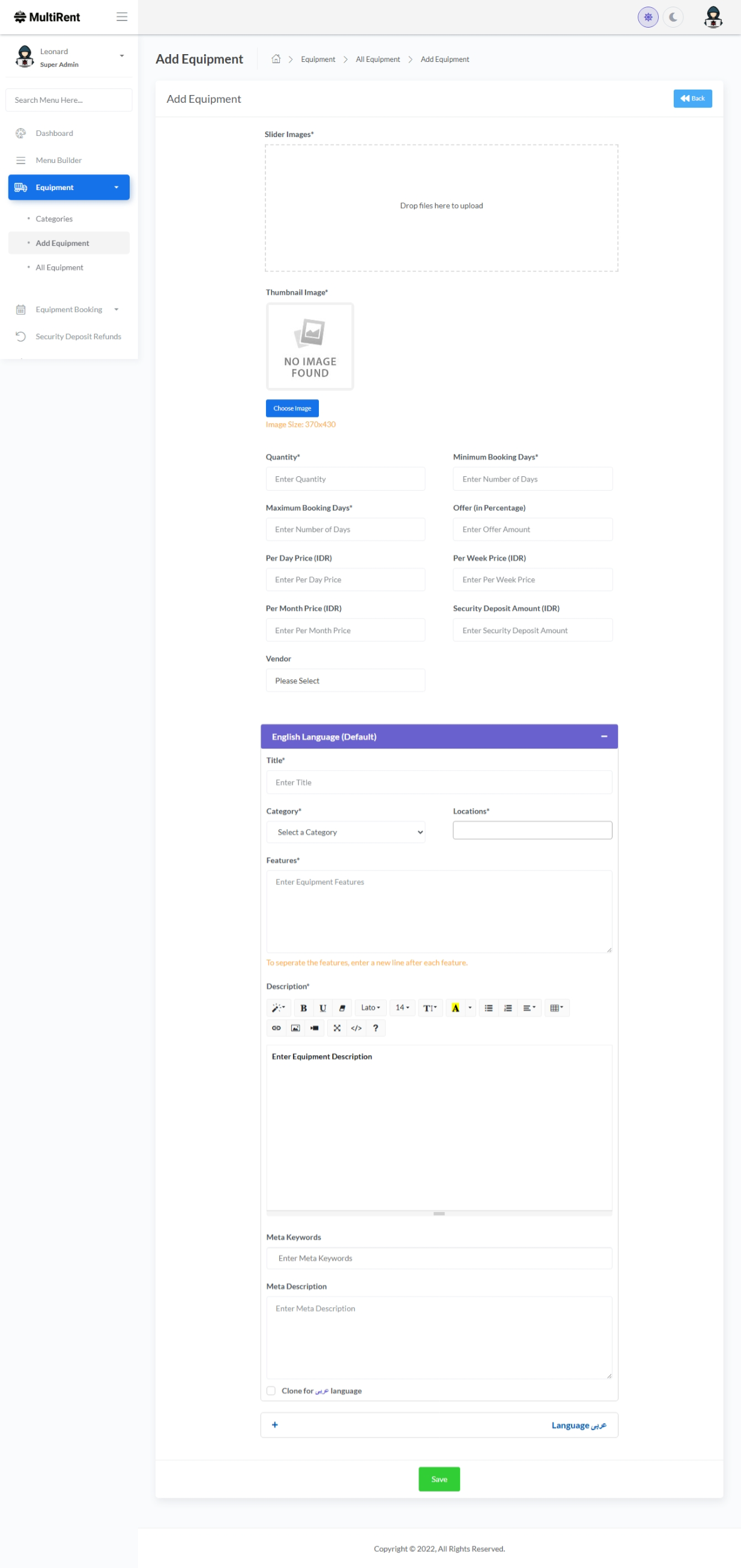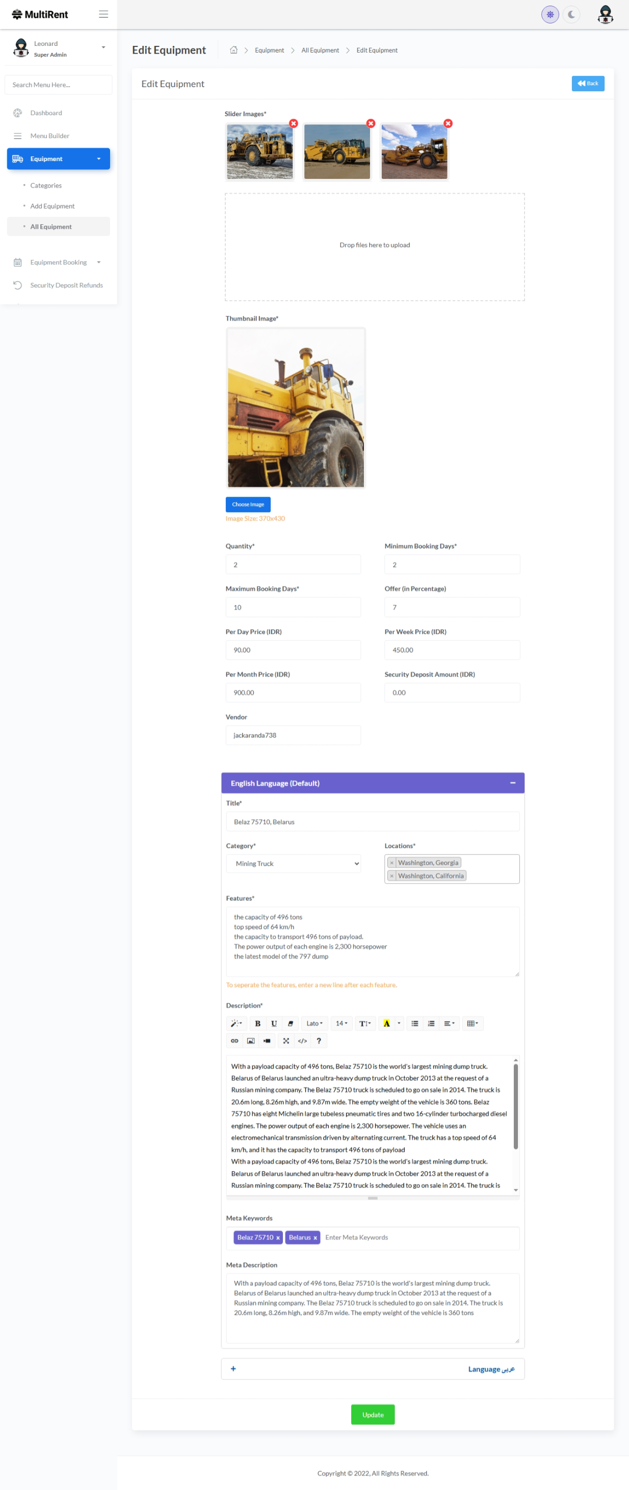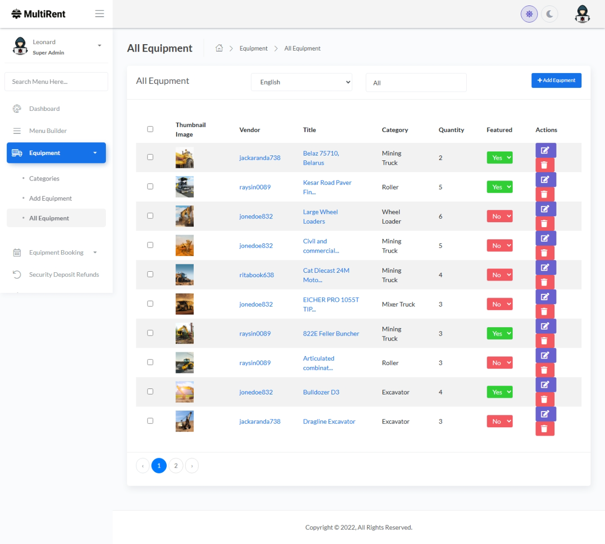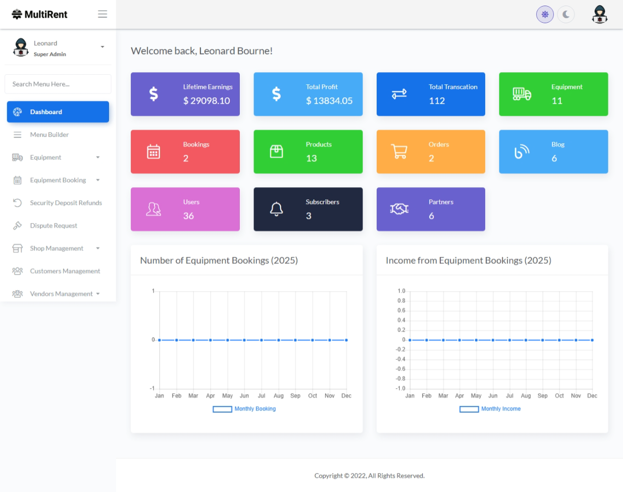 Multivendor Equipment Rental Website provides 6 themes (Construction Theme 1, Construction Theme 2, Camera Theme, Cycle Theme, Multipurpose Theme, Car Theme). It has Admin, Vendor & Customer Dashboard. The Admin panel is super powerful & flexible