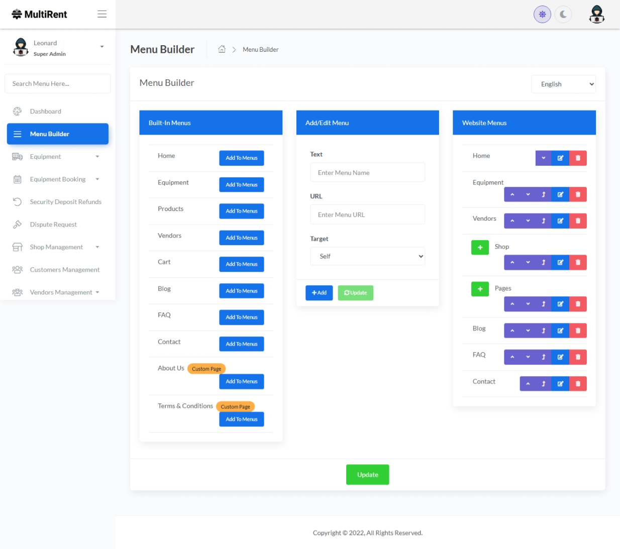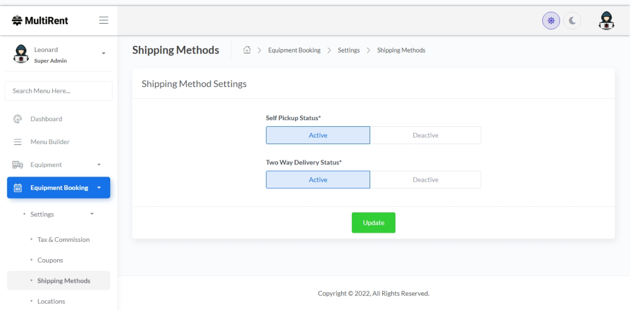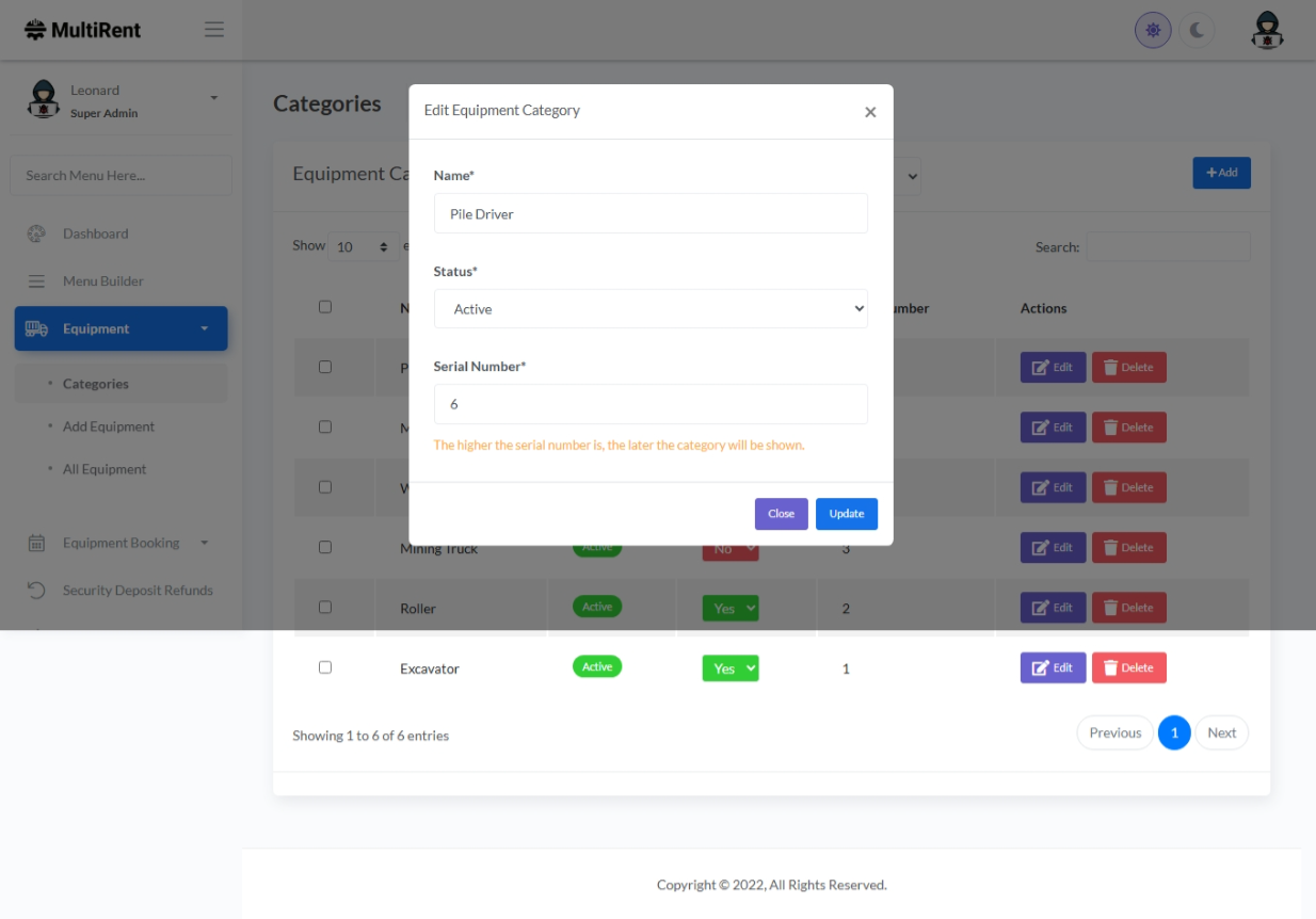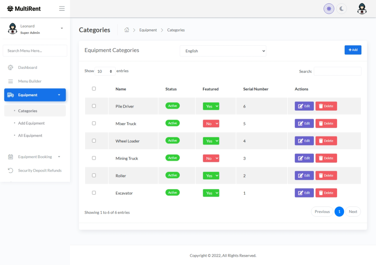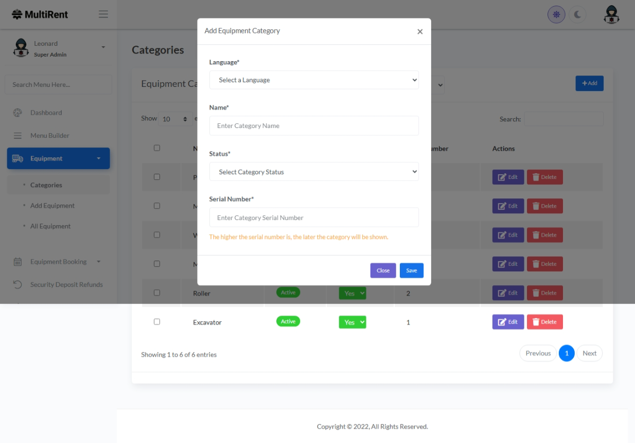 Multivendor Equipment Rental Website provides 6 themes (Construction Theme 1, Construction Theme 2, Camera Theme, Cycle Theme, Multipurpose Theme, Car Theme). It has Admin, Vendor & Customer Dashboard. The Admin panel is super powerful & flexible