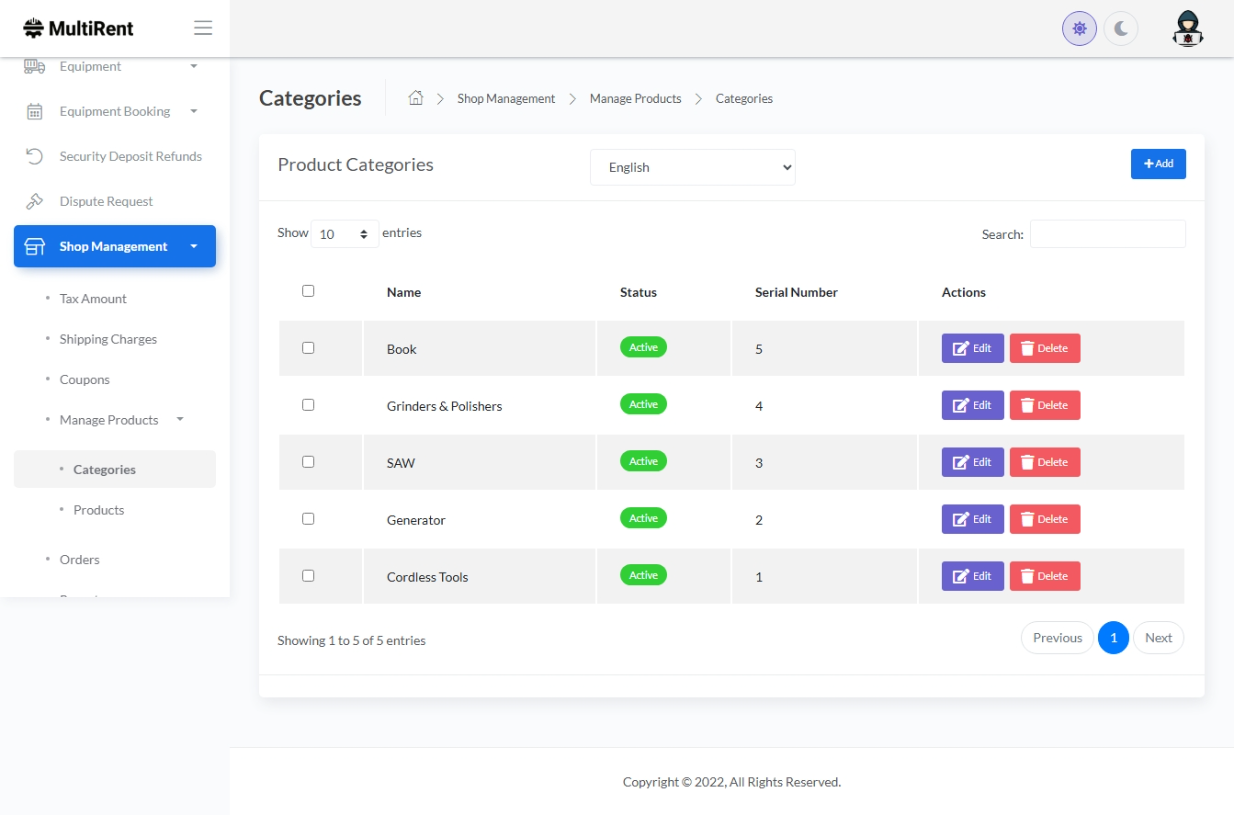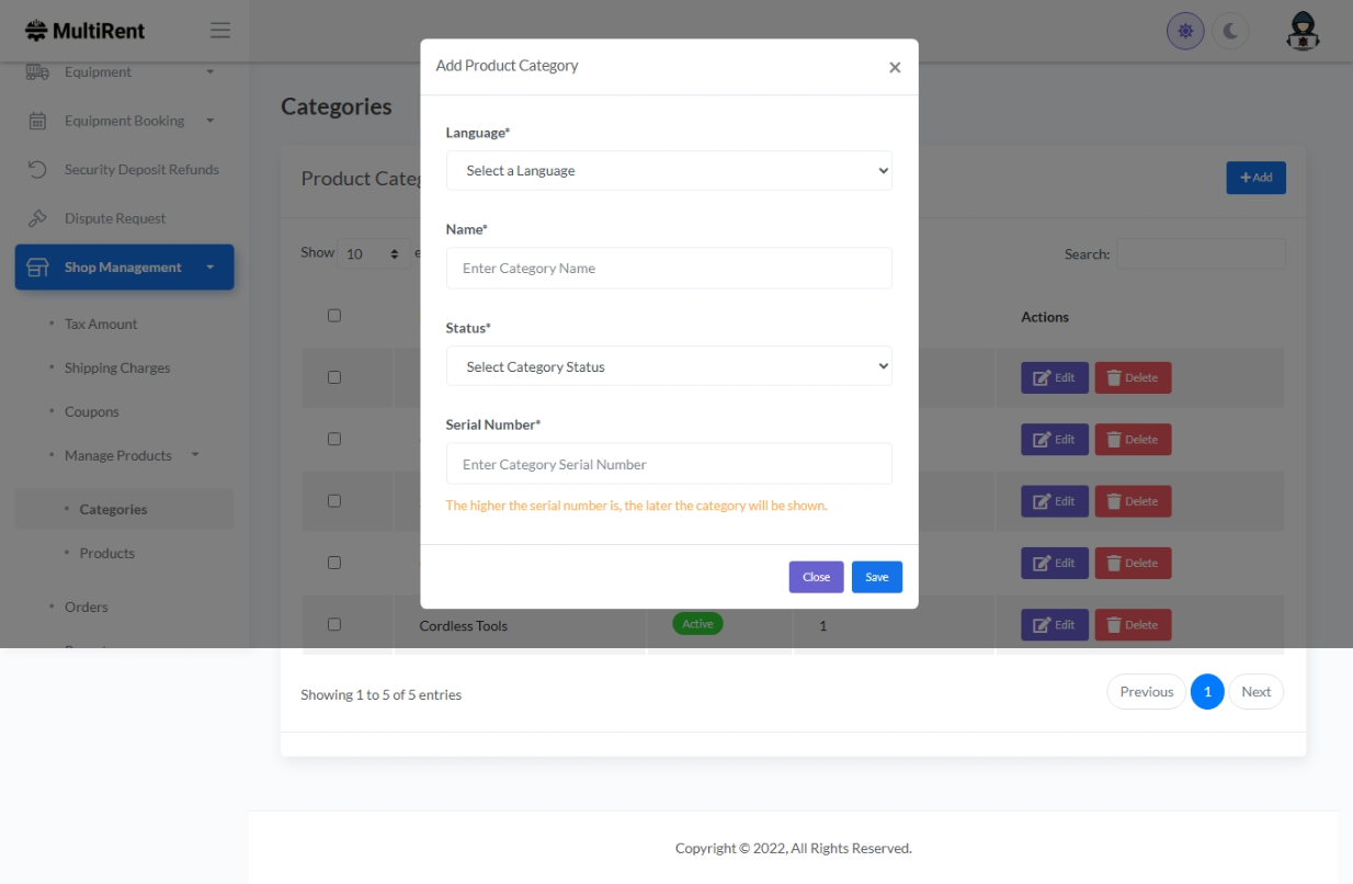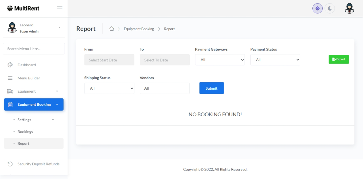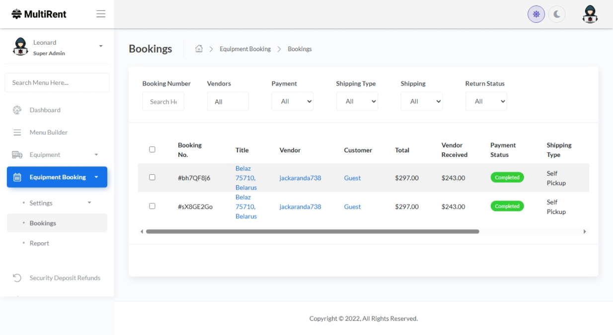 Multivendor Equipment Rental Website provides 6 themes (Construction Theme 1, Construction Theme 2, Camera Theme, Cycle Theme, Multipurpose Theme, Car Theme). It has Admin, Vendor & Customer Dashboard. The Admin panel is super powerful & flexible