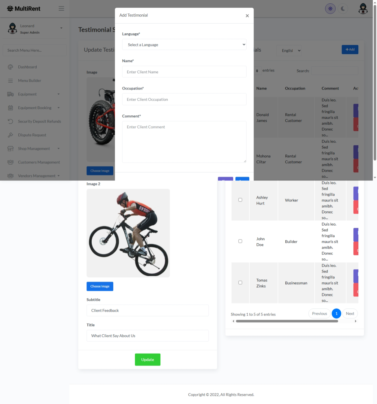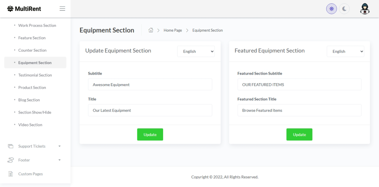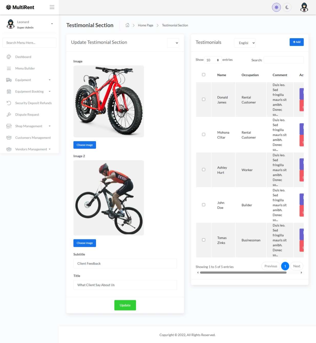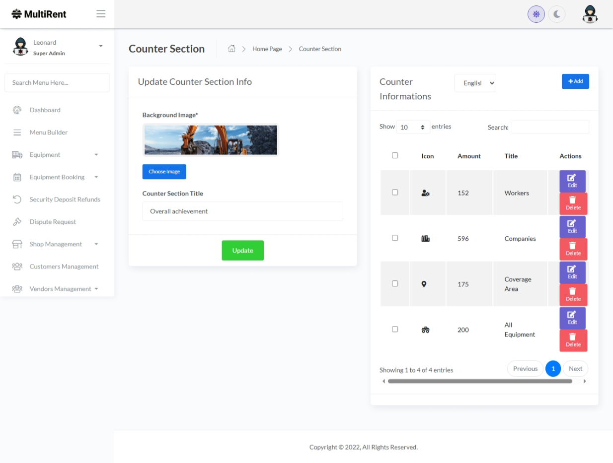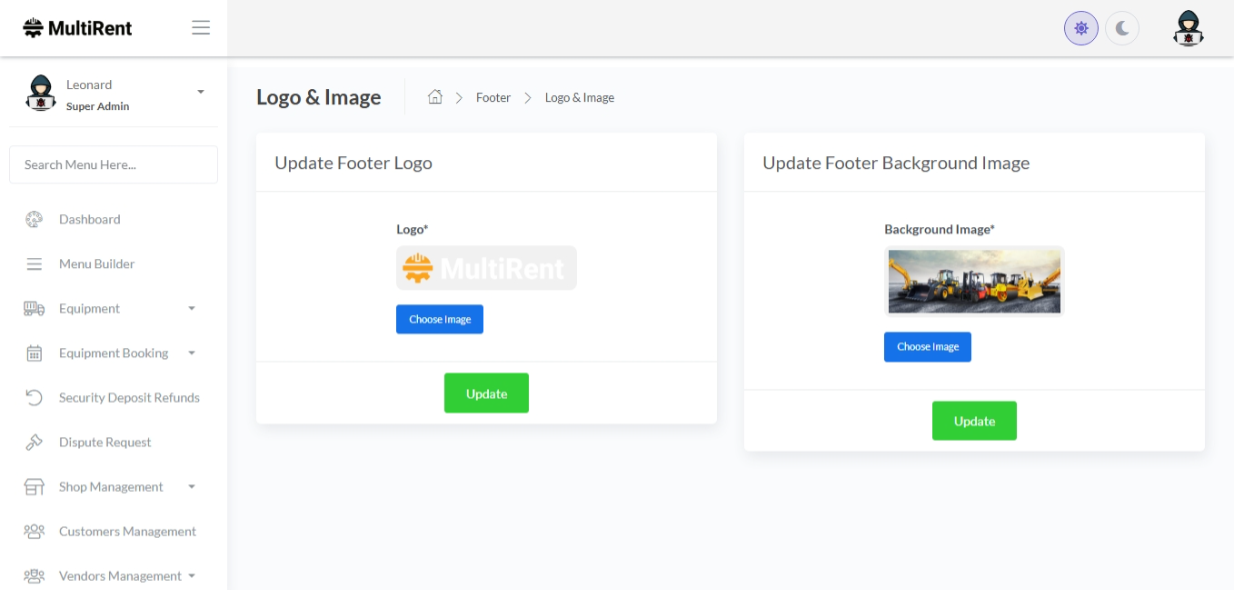 Multivendor Equipment Rental Website provides 6 themes (Construction Theme 1, Construction Theme 2, Camera Theme, Cycle Theme, Multipurpose Theme, Car Theme). It has Admin, Vendor & Customer Dashboard. The Admin panel is super powerful & flexible
