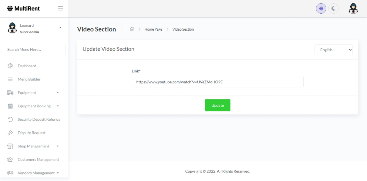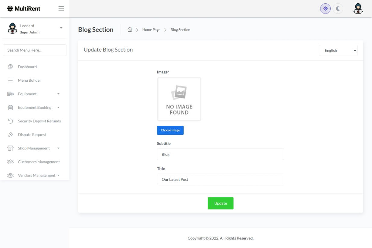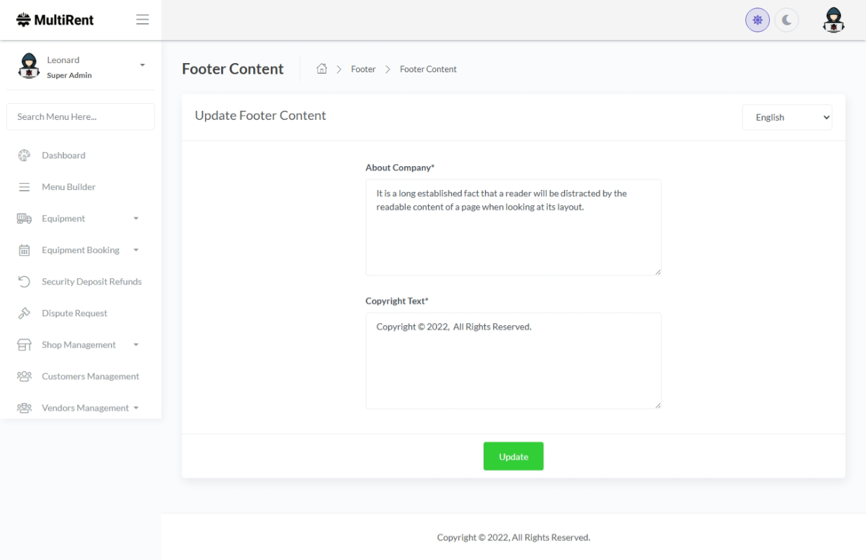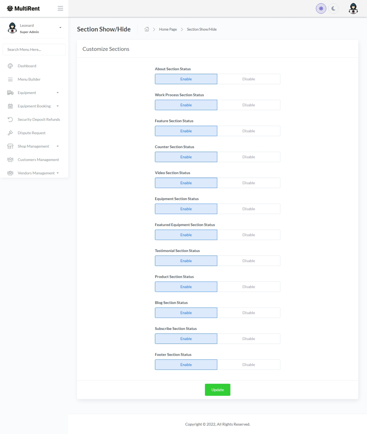 Multivendor Equipment Rental Website provides 6 themes (Construction Theme 1, Construction Theme 2, Camera Theme, Cycle Theme, Multipurpose Theme, Car Theme). It has Admin, Vendor & Customer Dashboard. The Admin panel is super powerful & flexible