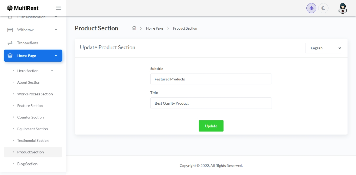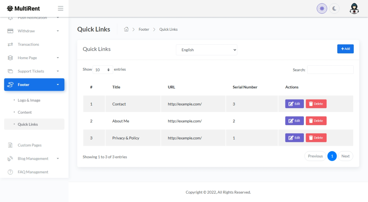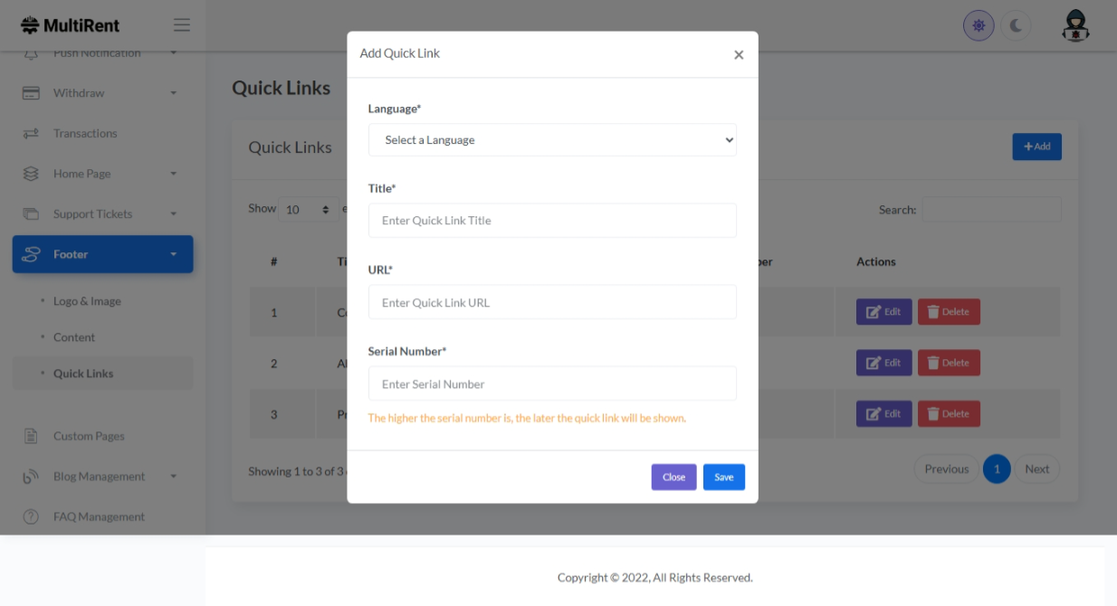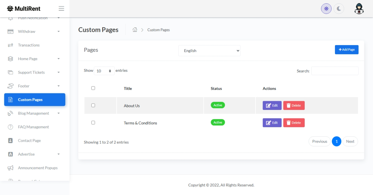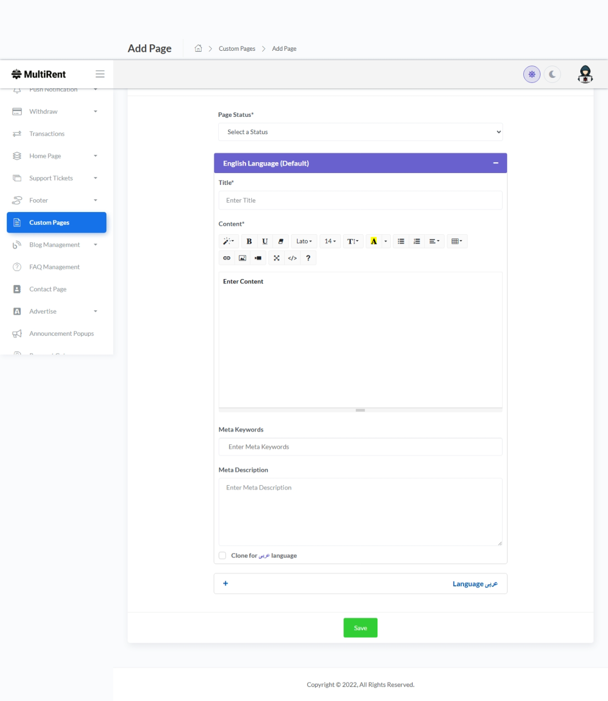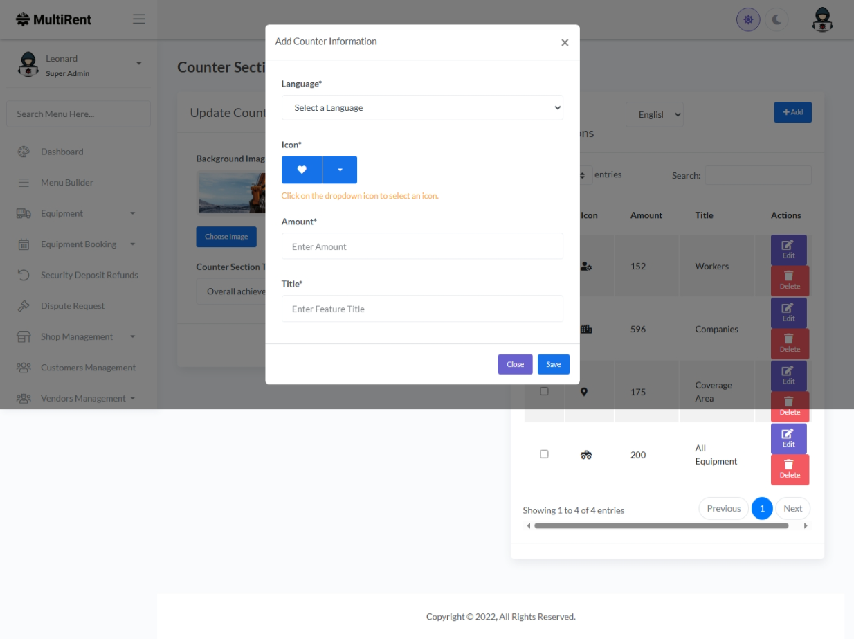 MultiRent also provides Commissions, Reports, Transaction Reports, Monthwise Earning Reports, Tax, Coupon, All Kinds of Management, Drag & Drop Menu Builder, Popup Banner Builder, PWA Installability, Push Notification, Google Login, Facebook Login, Advertisements, Google Adsense Support, Admin Role Permission & much more...