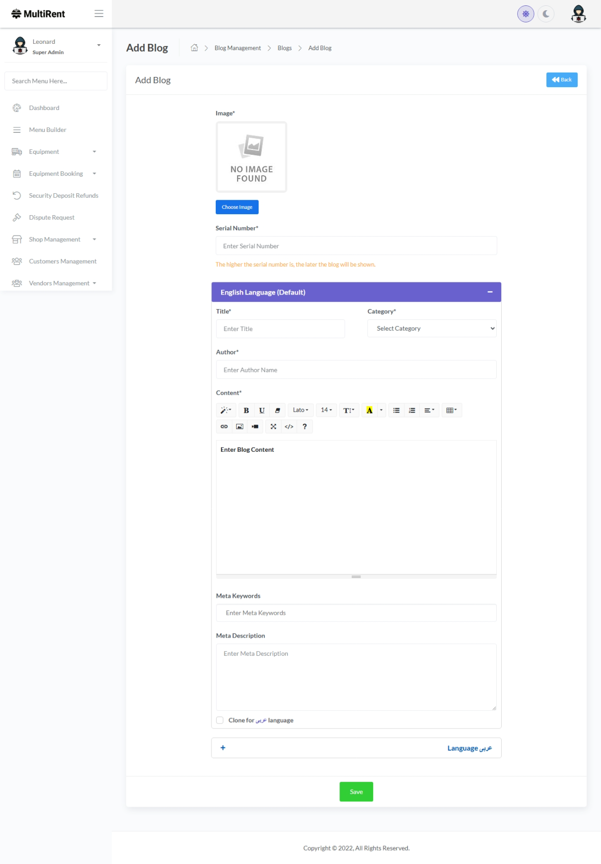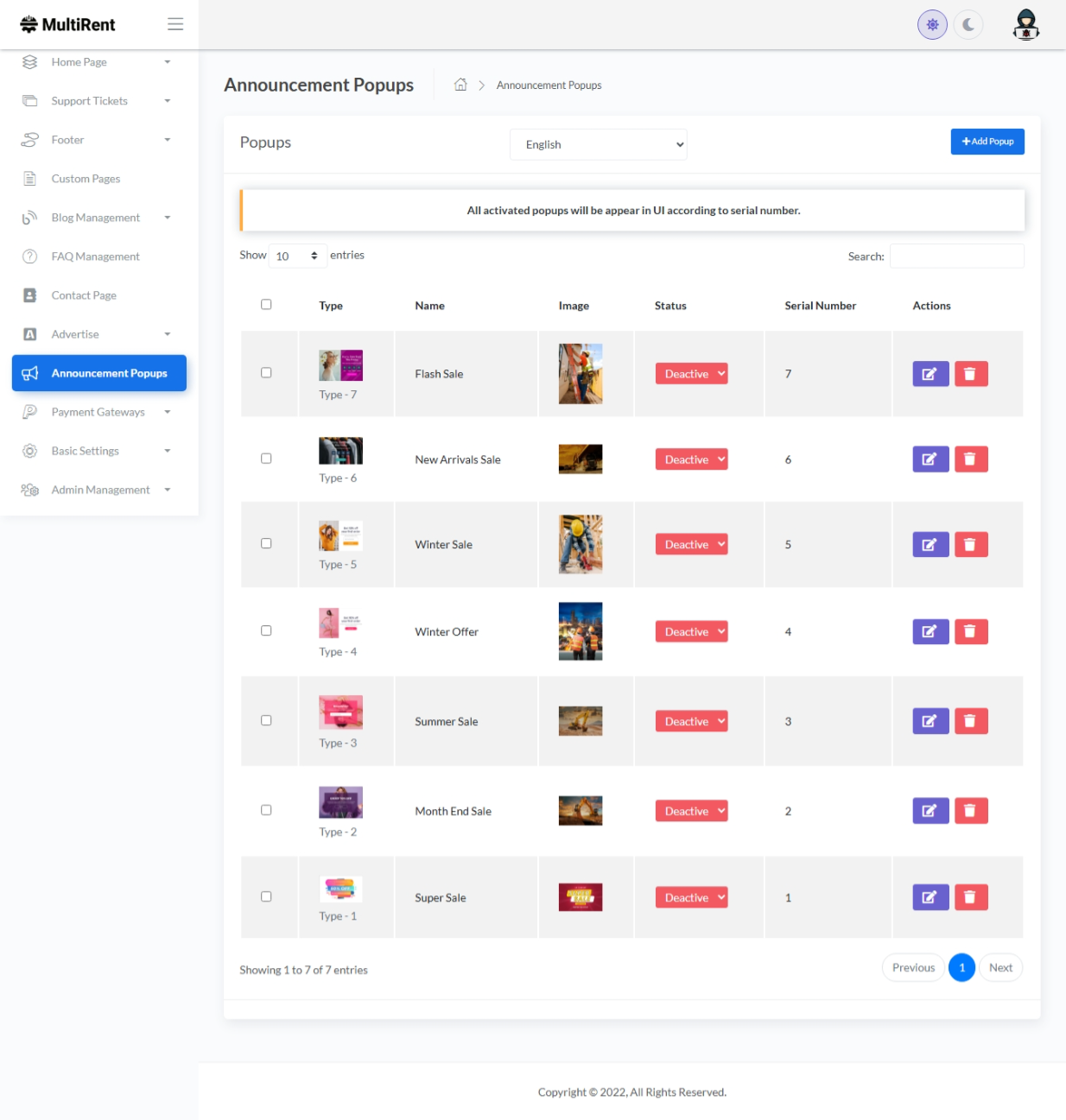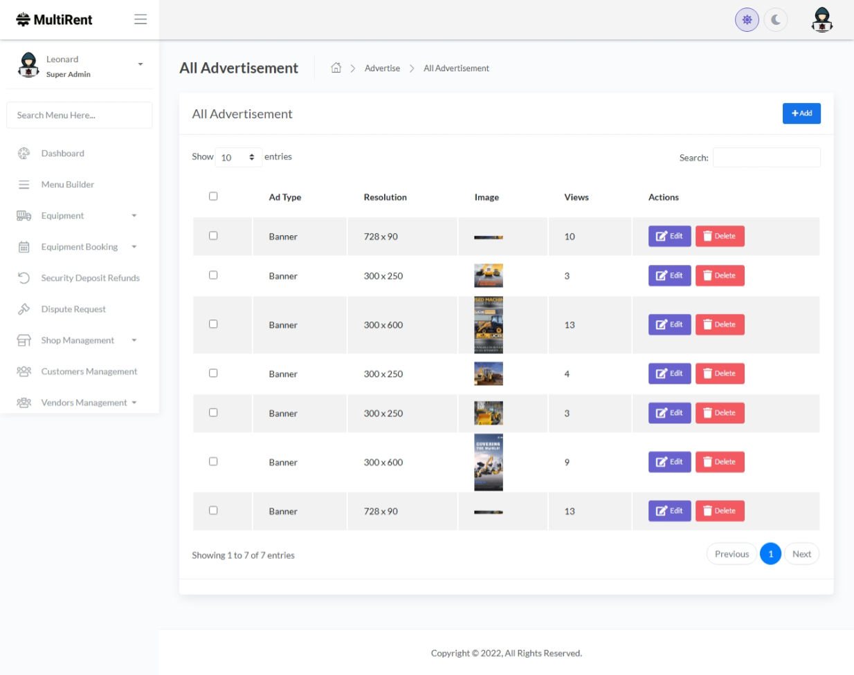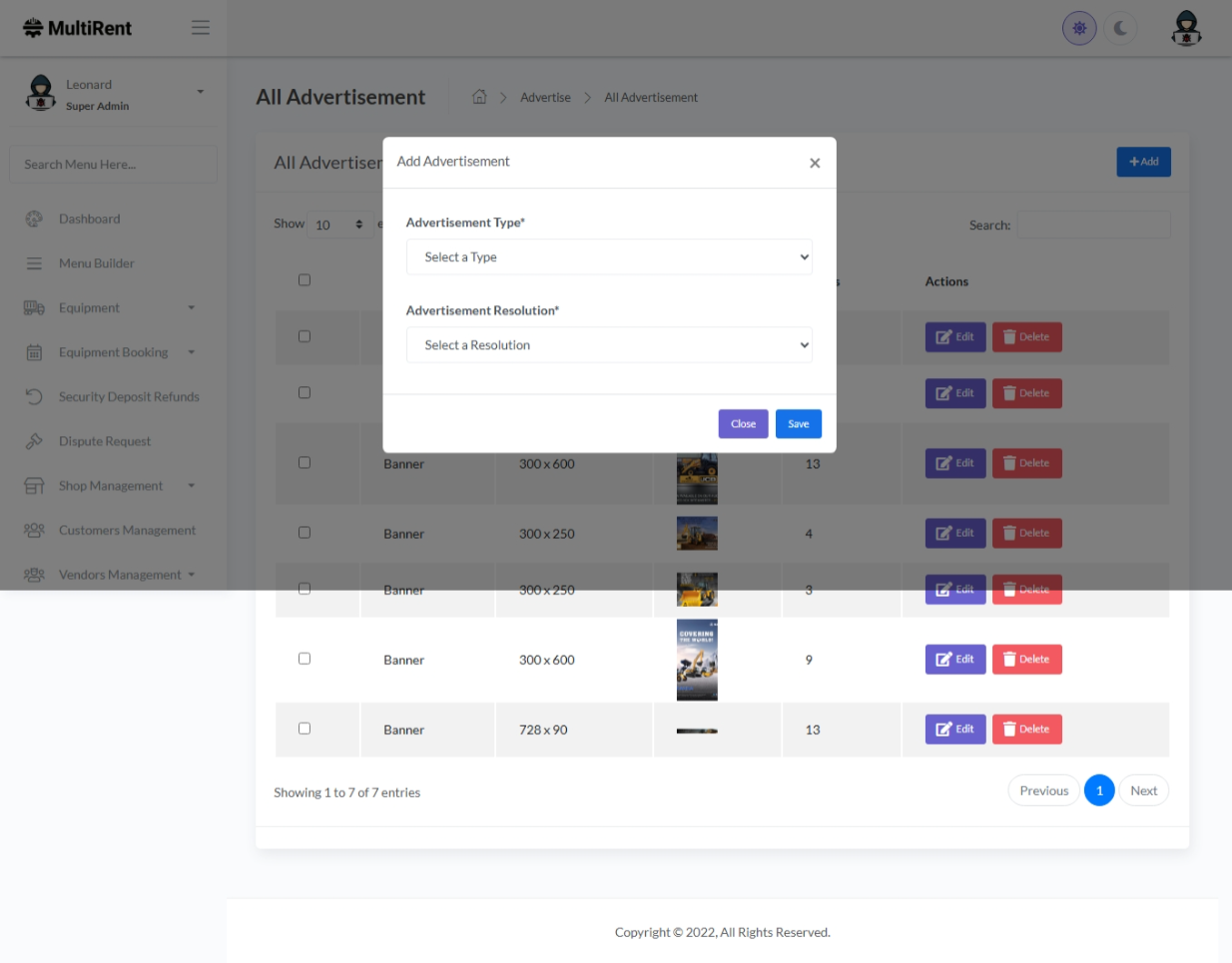 MultiRent also provides Commissions, Reports, Transaction Reports, Monthwise Earning Reports, Tax, Coupon, All Kinds of Management, Drag & Drop Menu Builder, Popup Banner Builder, PWA Installability, Push Notification, Google Login, Facebook Login, Advertisements, Google Adsense Support, Admin Role Permission & much more...