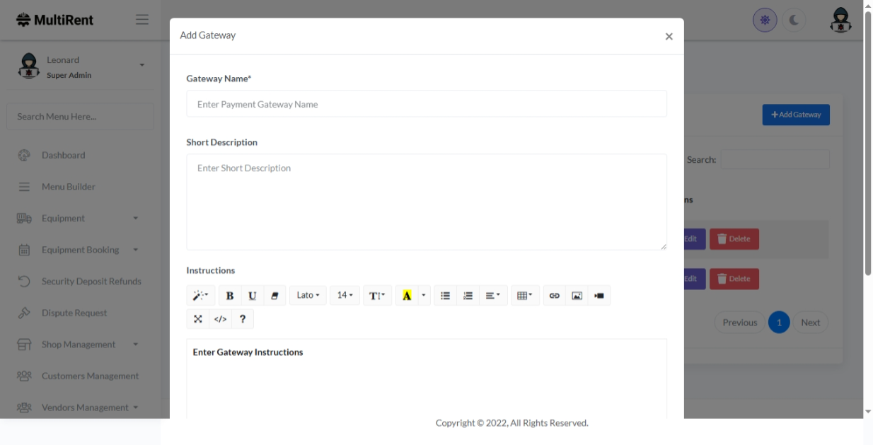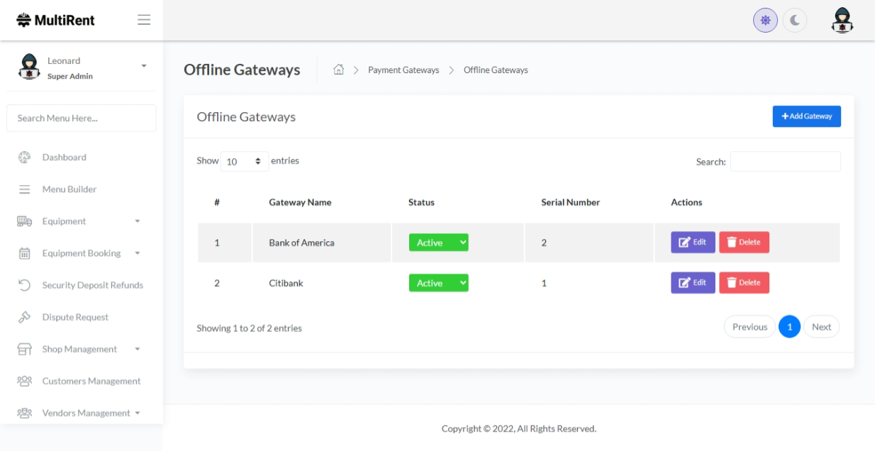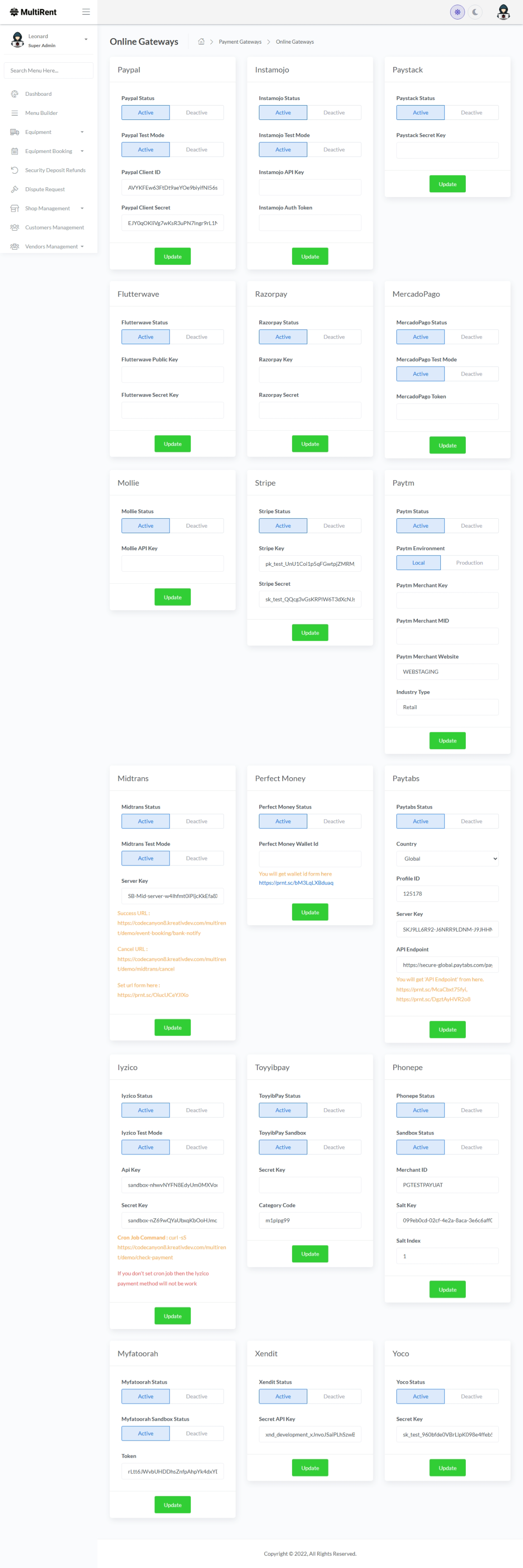 MultiRent provides 18 automated payment gateways (Paypal, Stripe, PayTM, Mercadopago, instamojo, mollie, Razorpay, Paystack, Flutterwave, Toyyibpay, Iyzico, Midtrans, PayTabs, myFatoorah, PhonePe, Yoco, Xendit, Perfect Money) & unlimited offline gateways to collect payment