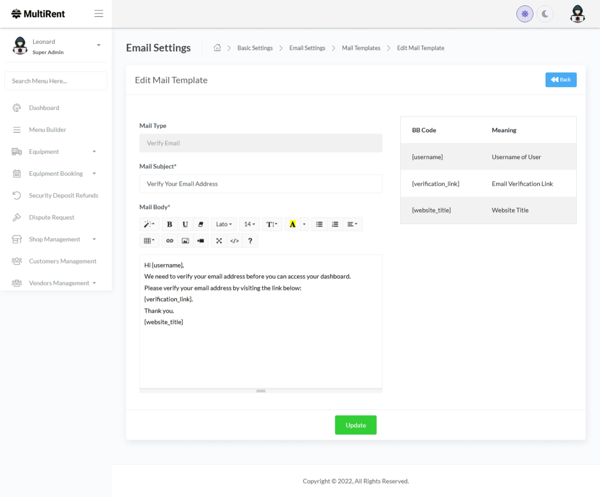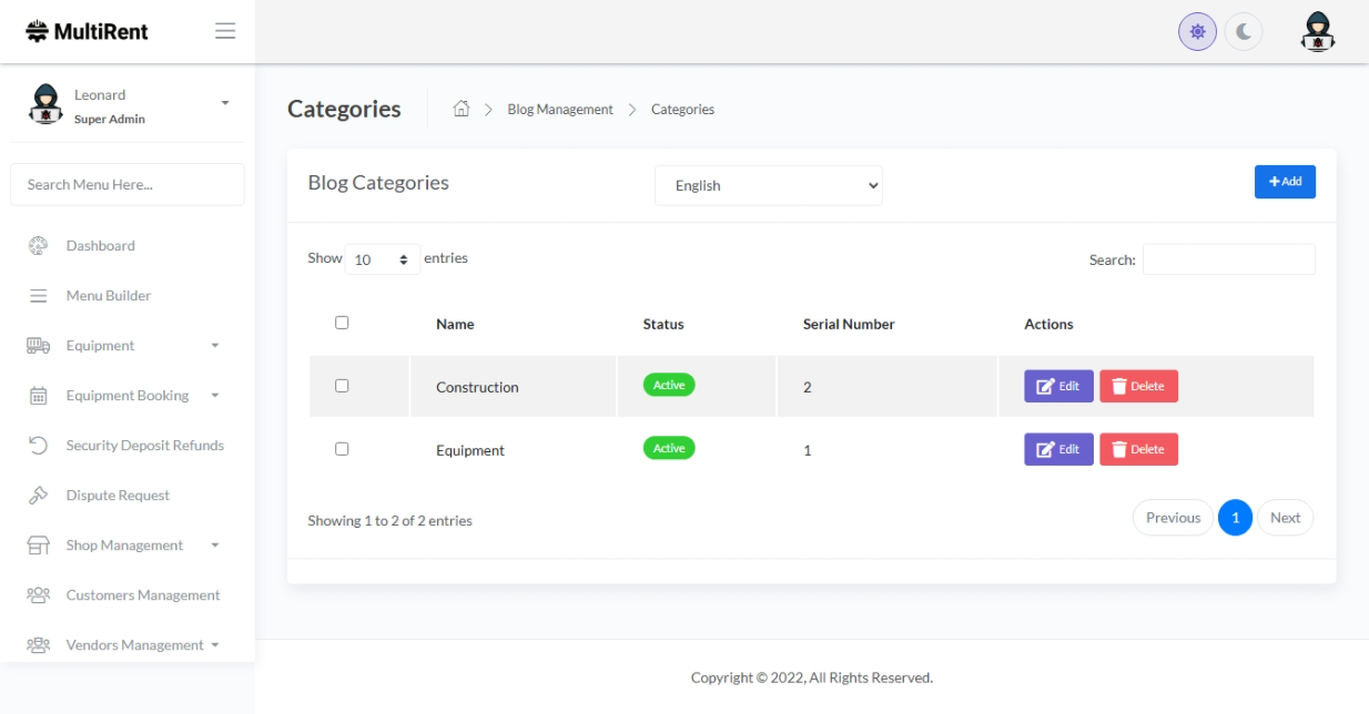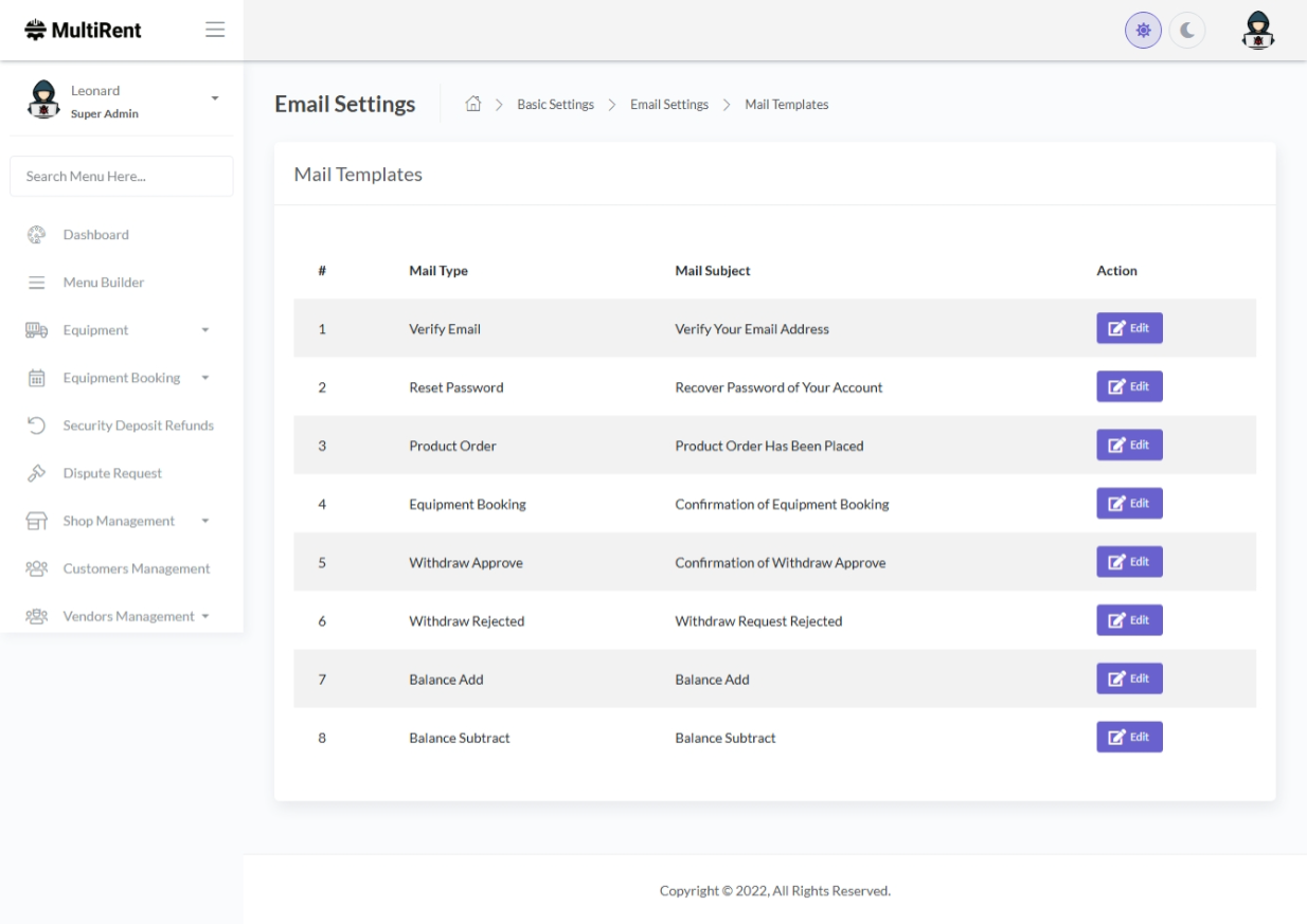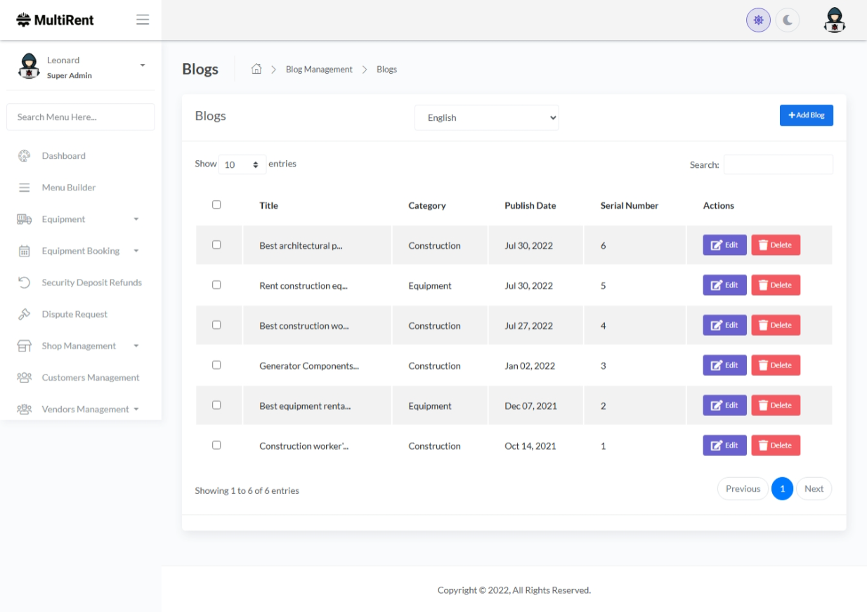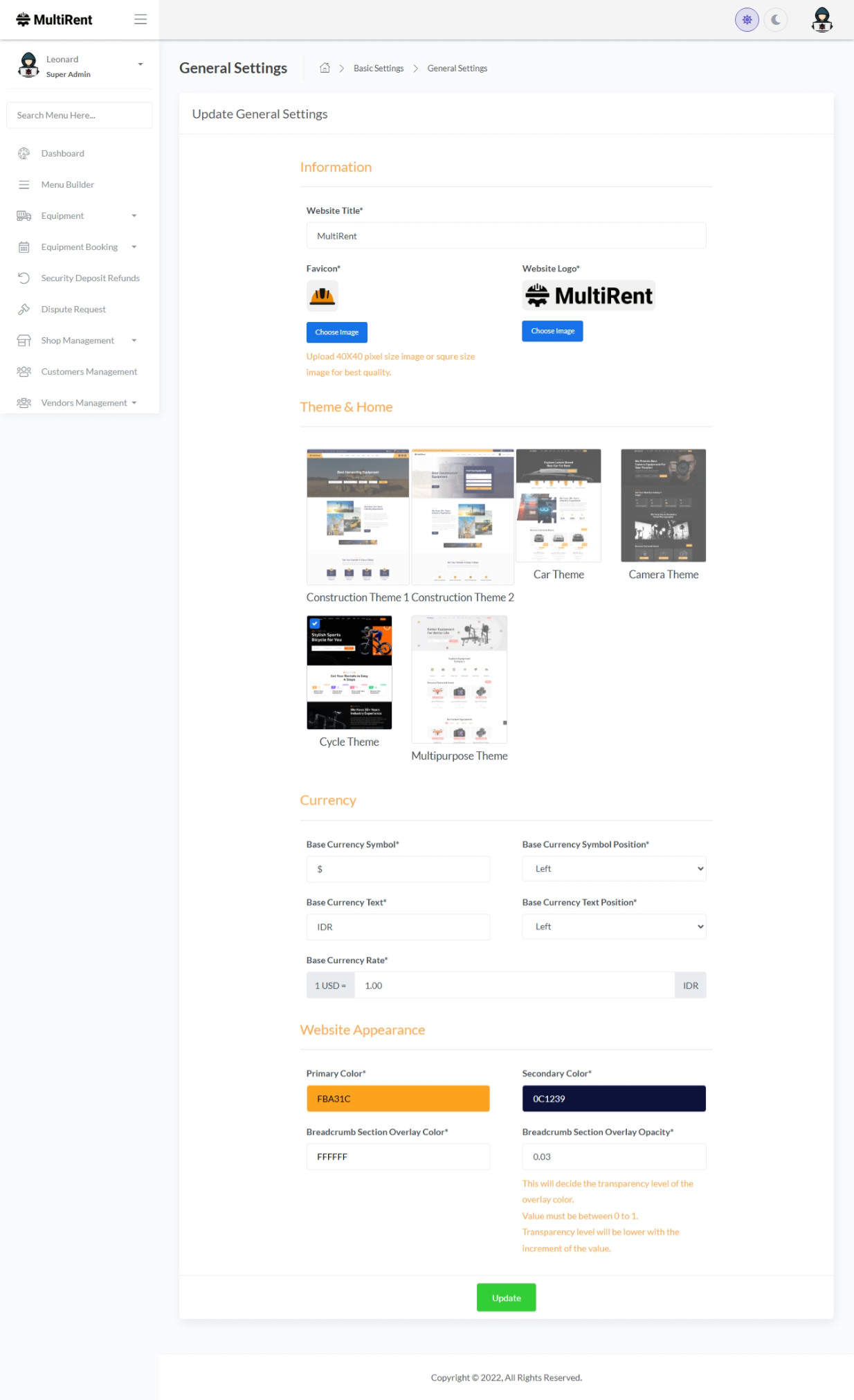 Multivendor Equipment Rental Website provides 6 themes (Construction Theme 1, Construction Theme 2, Camera Theme, Cycle Theme, Multipurpose Theme, Car Theme). It has Admin, Vendor & Customer Dashboard. The Admin panel is super powerful & flexible