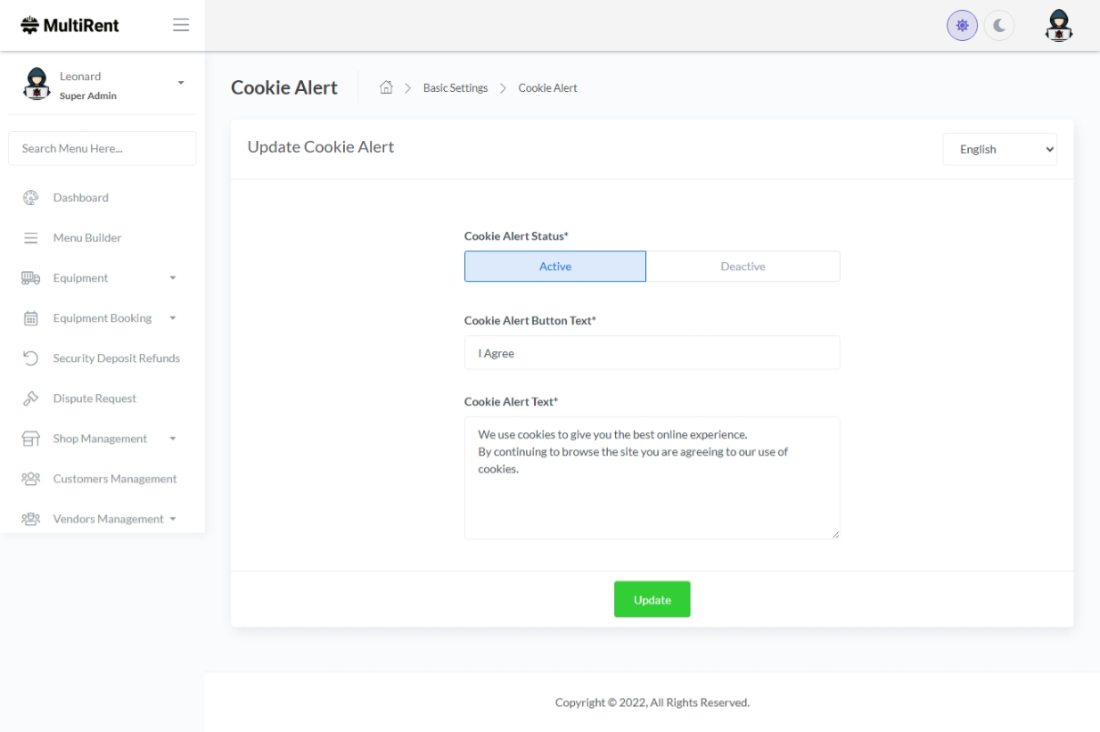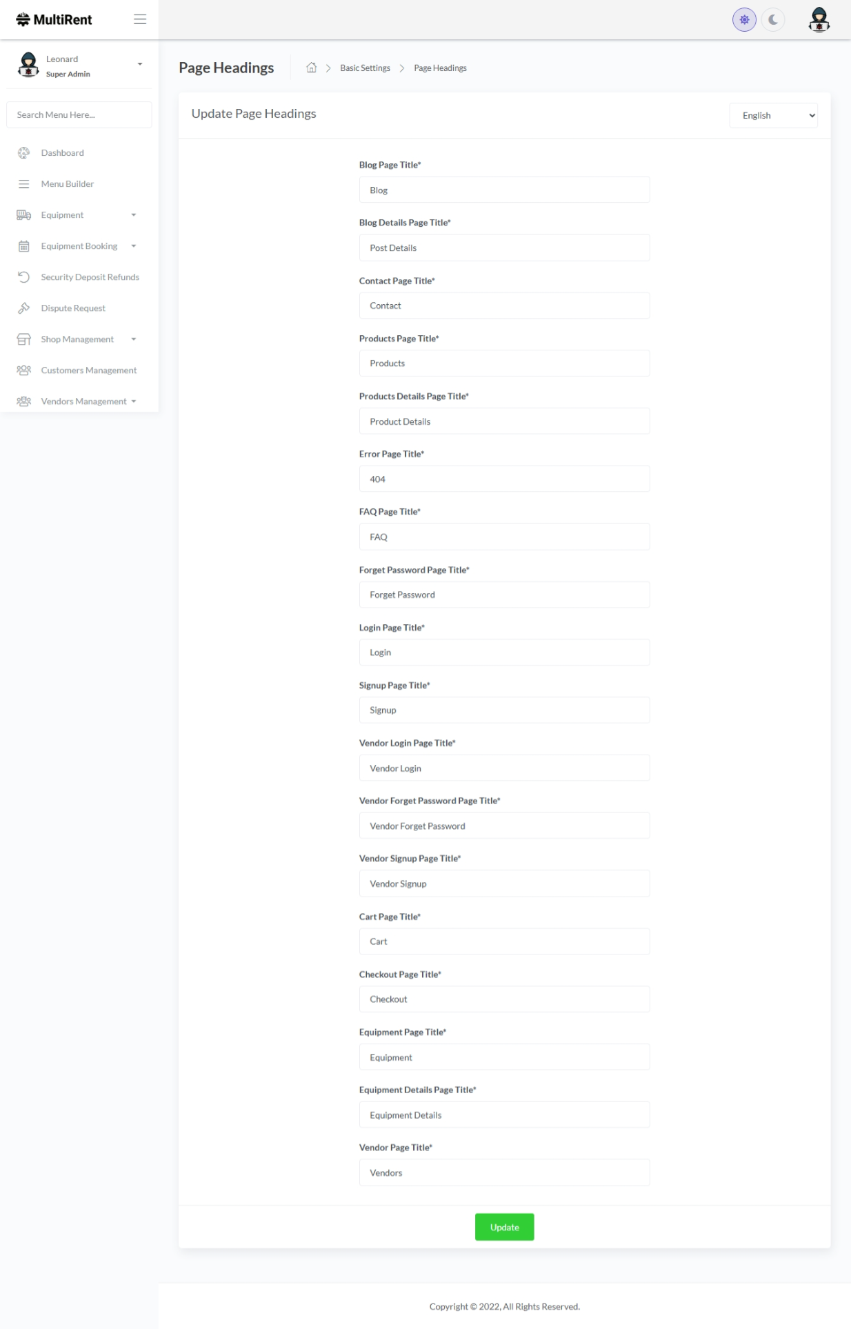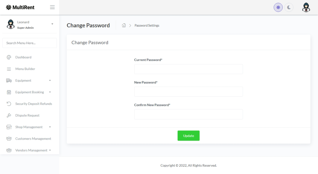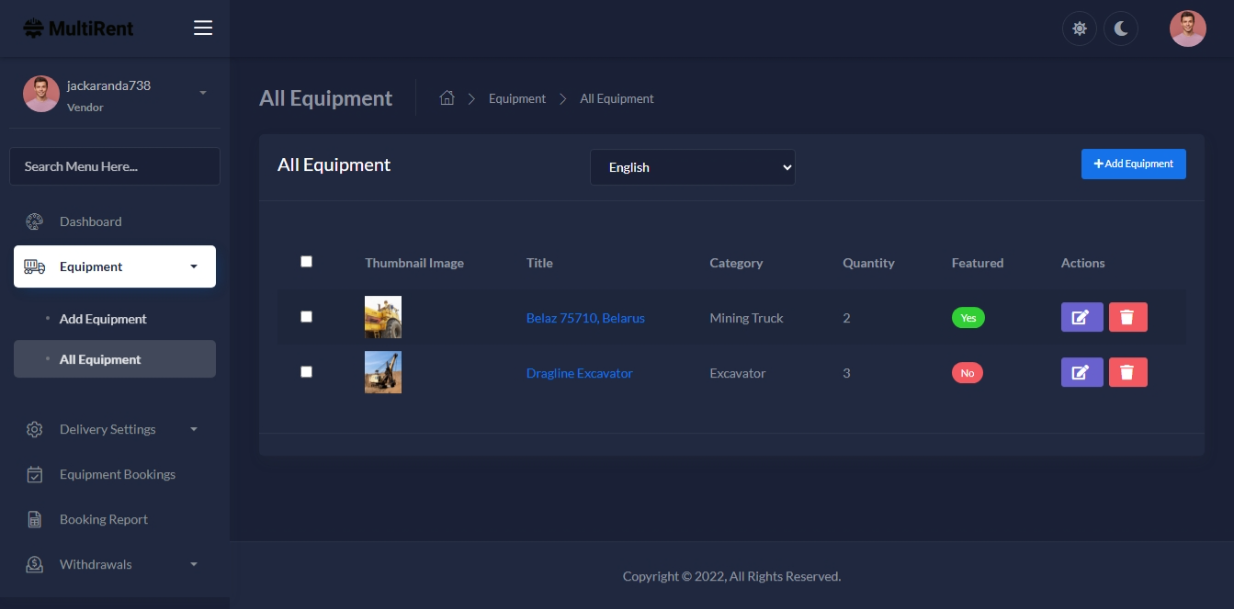 Multivendor Equipment Rental Website provides 6 themes (Construction Theme 1, Construction Theme 2, Camera Theme, Cycle Theme, Multipurpose Theme, Car Theme). It has Admin, Vendor & Customer Dashboard. The Admin panel is super powerful & flexible