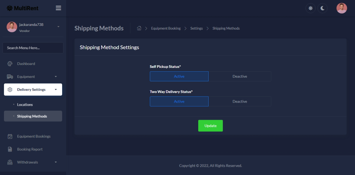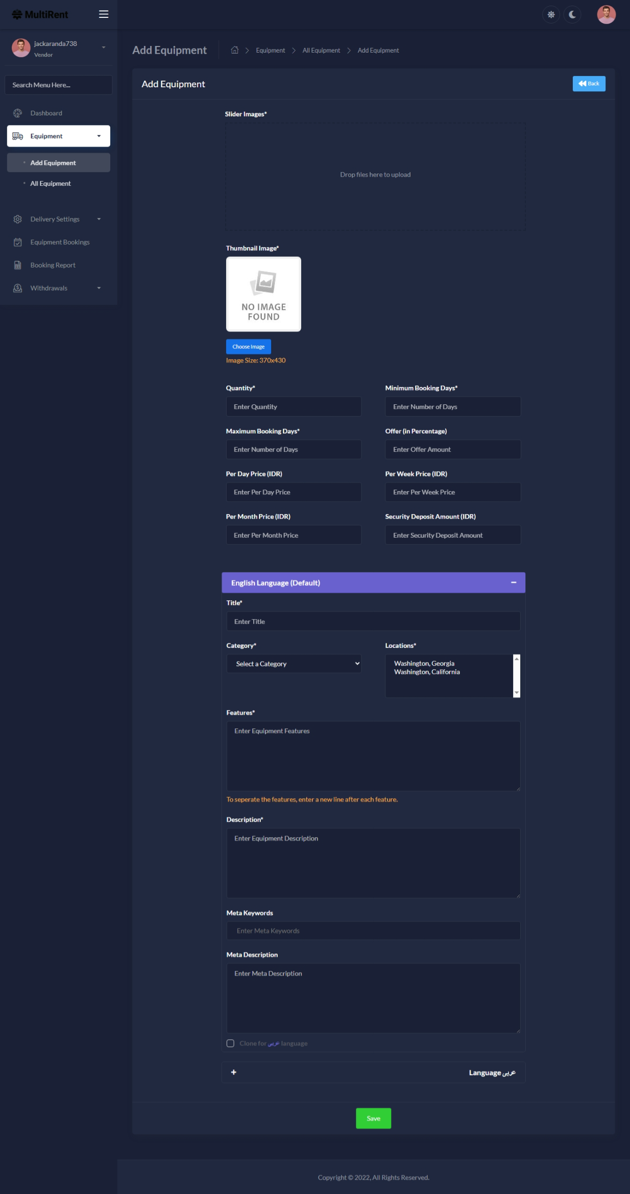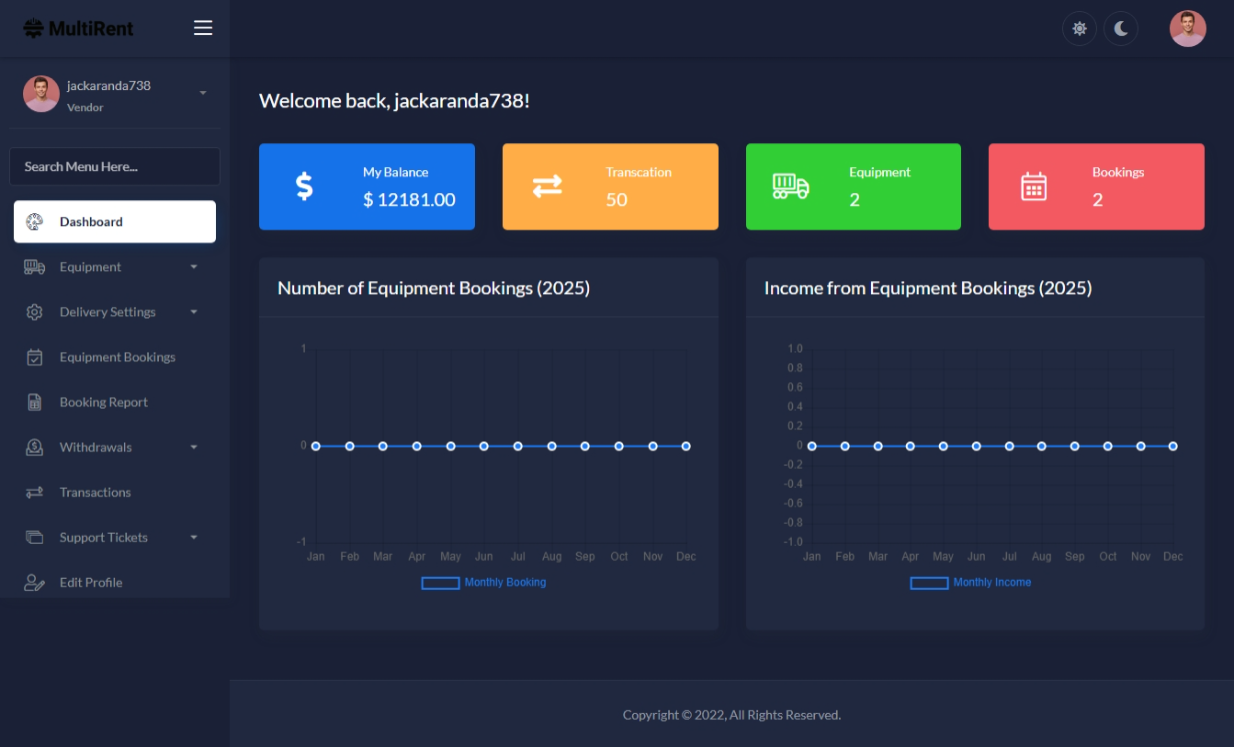 Admin can set commission percentage for each Equipment bookings. Vendors can withdraw their earnings. Admin can also charge on the withdrawals too