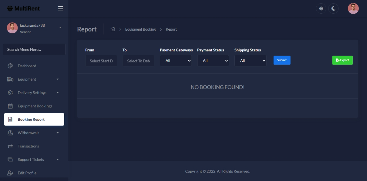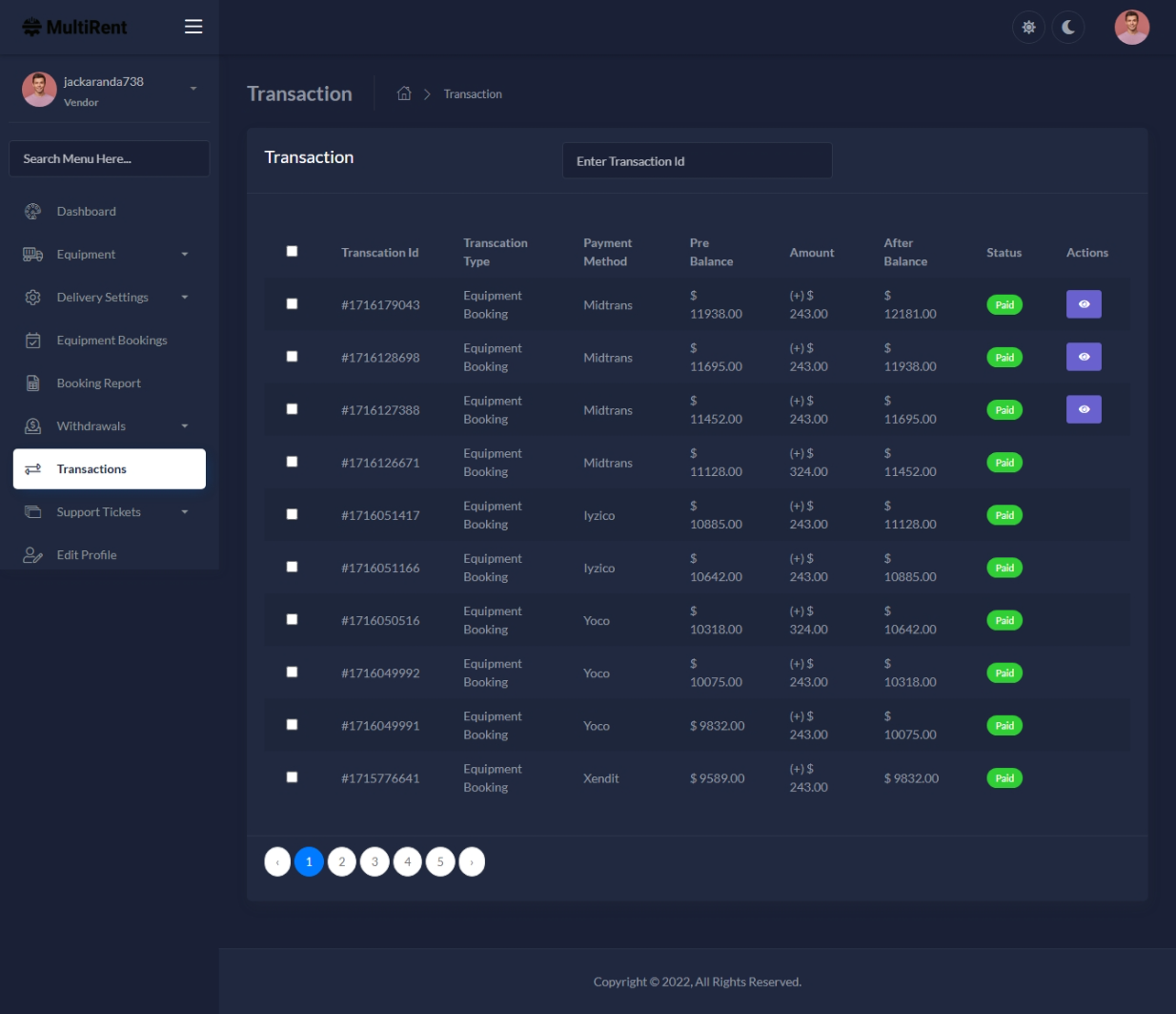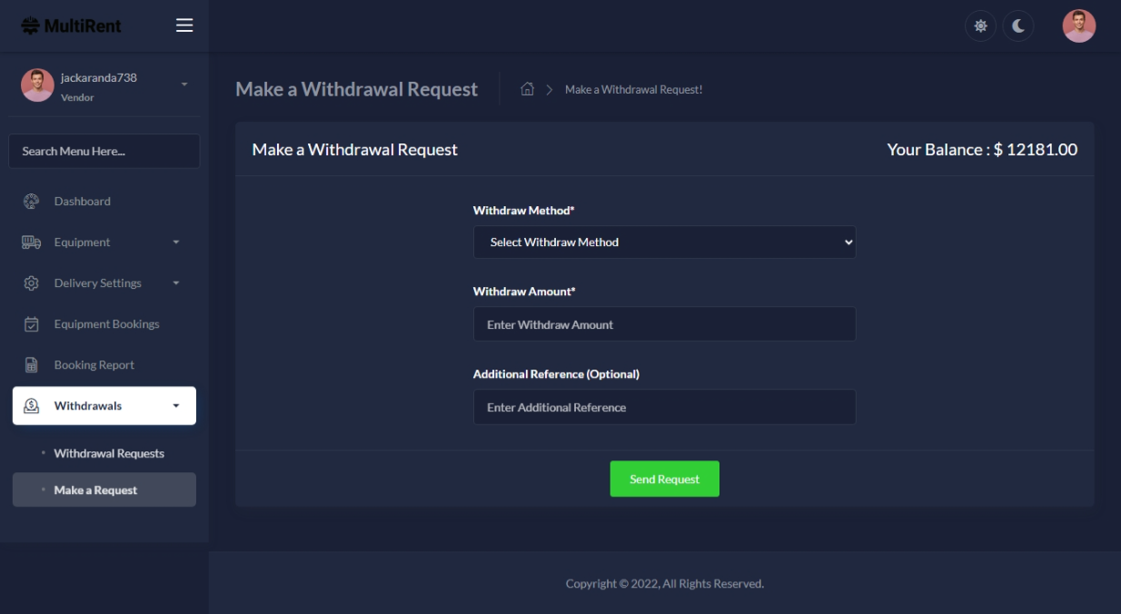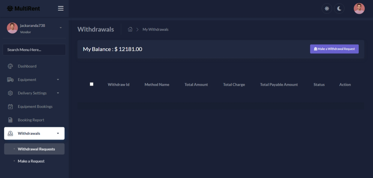 Admin can set commission percentage for each Equipment bookings. Vendors can withdraw their earnings. Admin can also charge on the withdrawals too