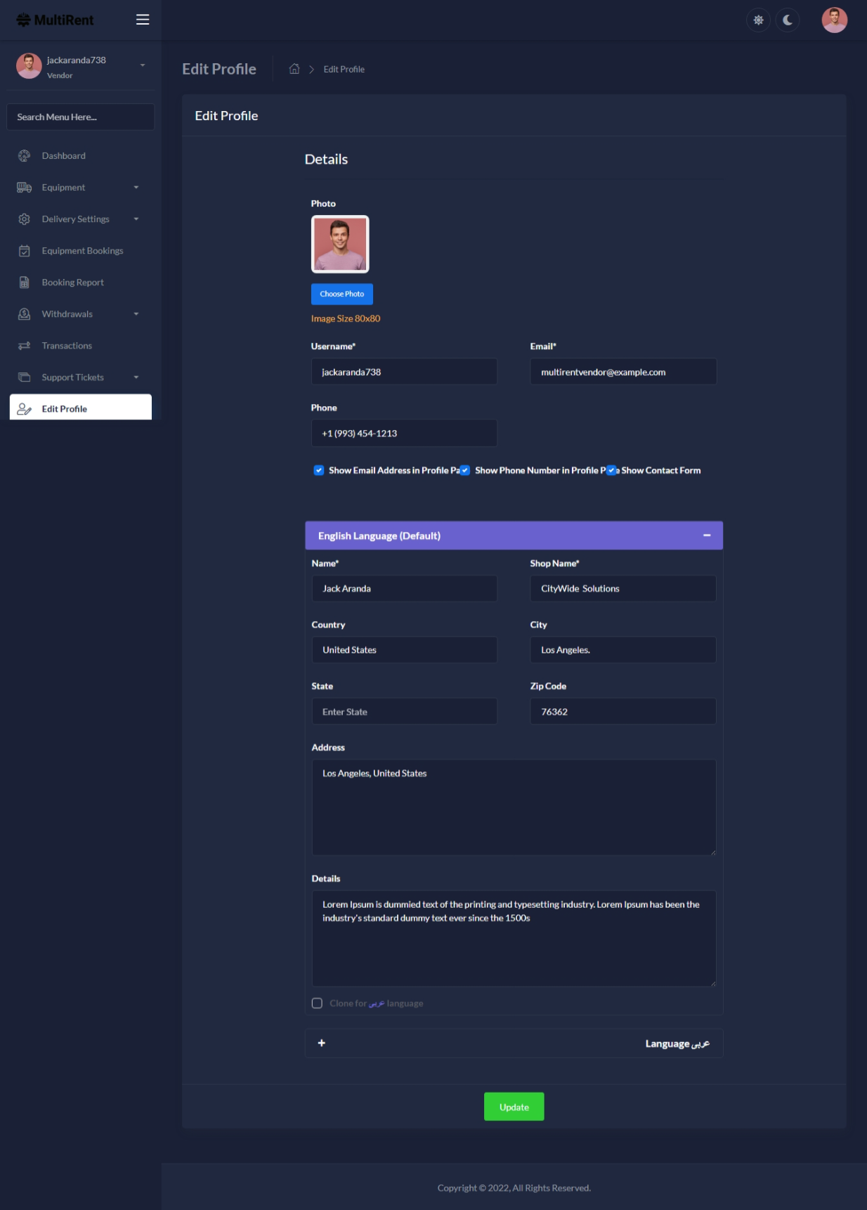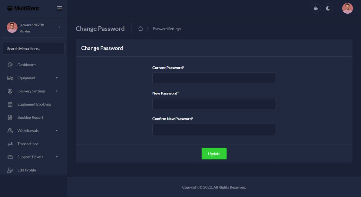Multivendor Equipment Rental Website provides 6 themes (Construction Theme 1, Construction Theme 2, Camera Theme, Cycle Theme, Multipurpose Theme, Car Theme). It has Admin, Vendor & Customer Dashboard. The Admin panel is super powerful & flexible