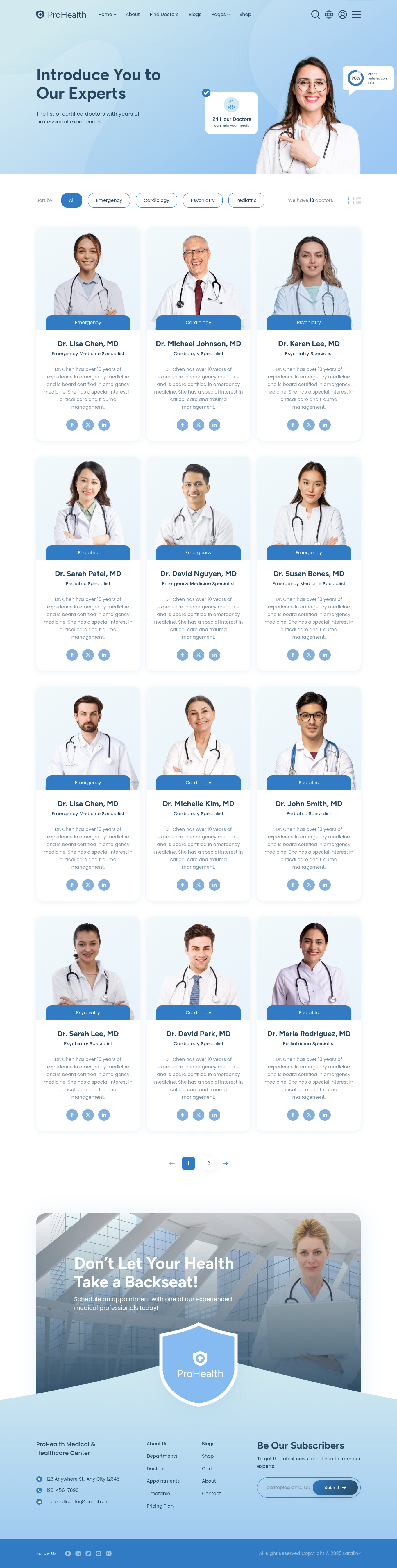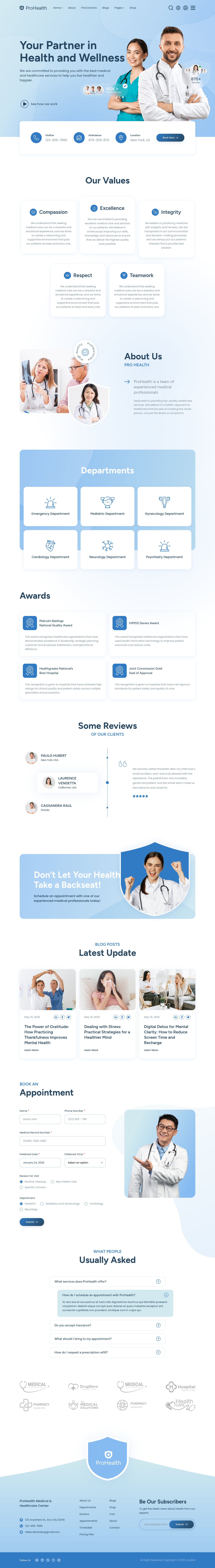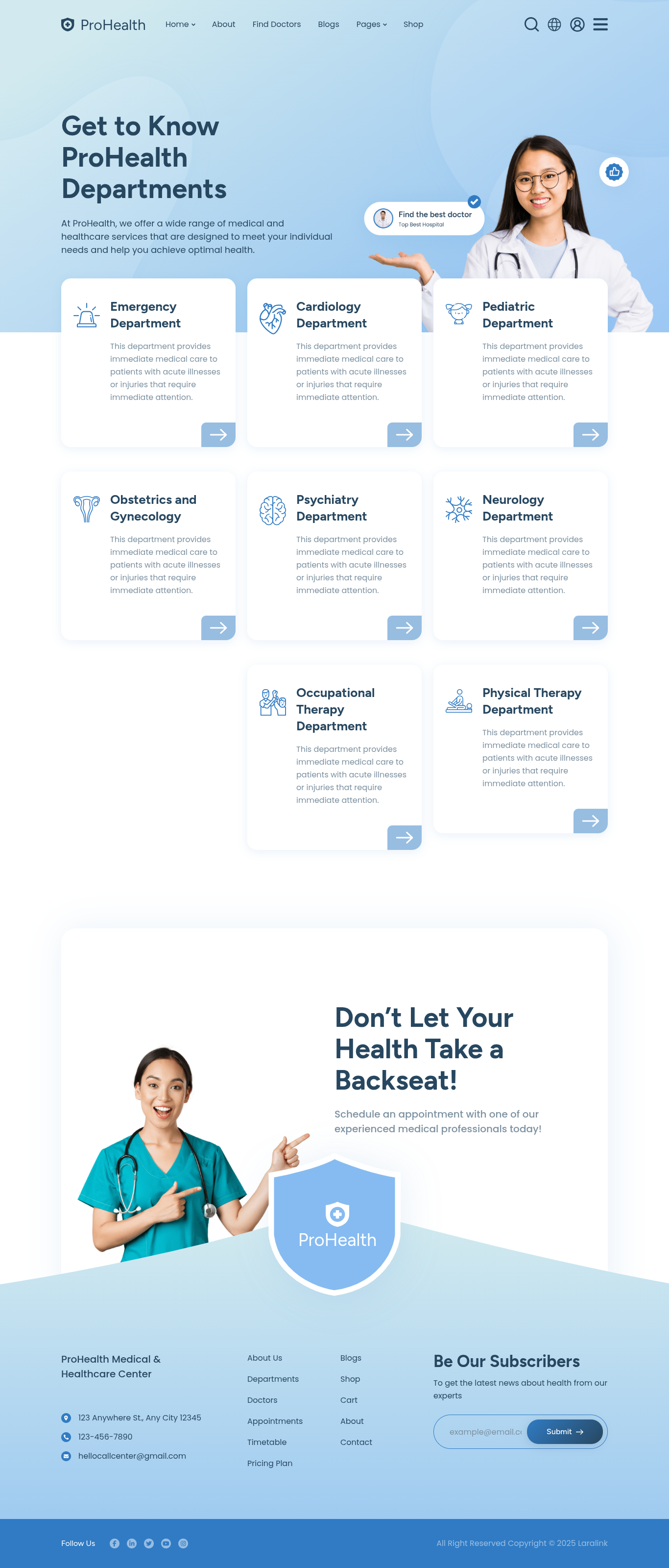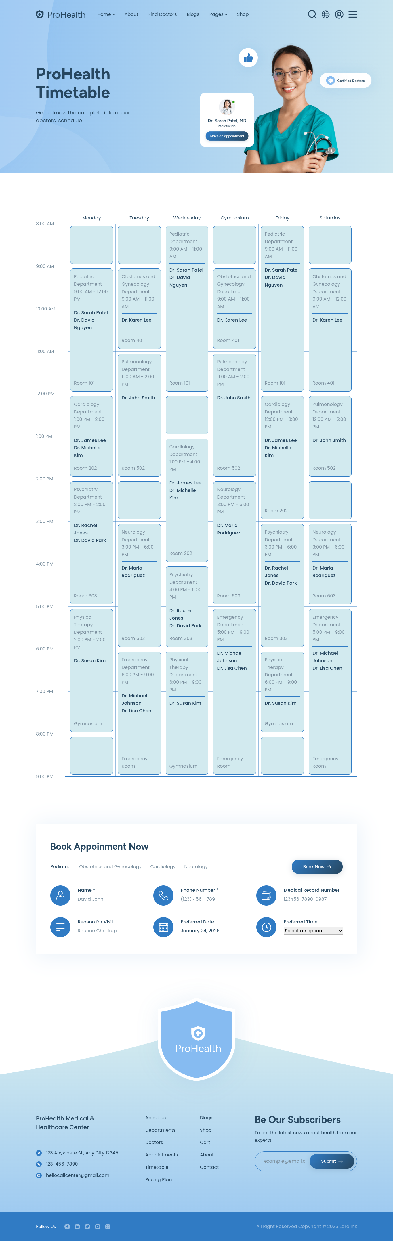 - All relevant pages available, like About, Find Doctor, Blogs, Appointment, Department, Timetable, Contact, FAQ, etc