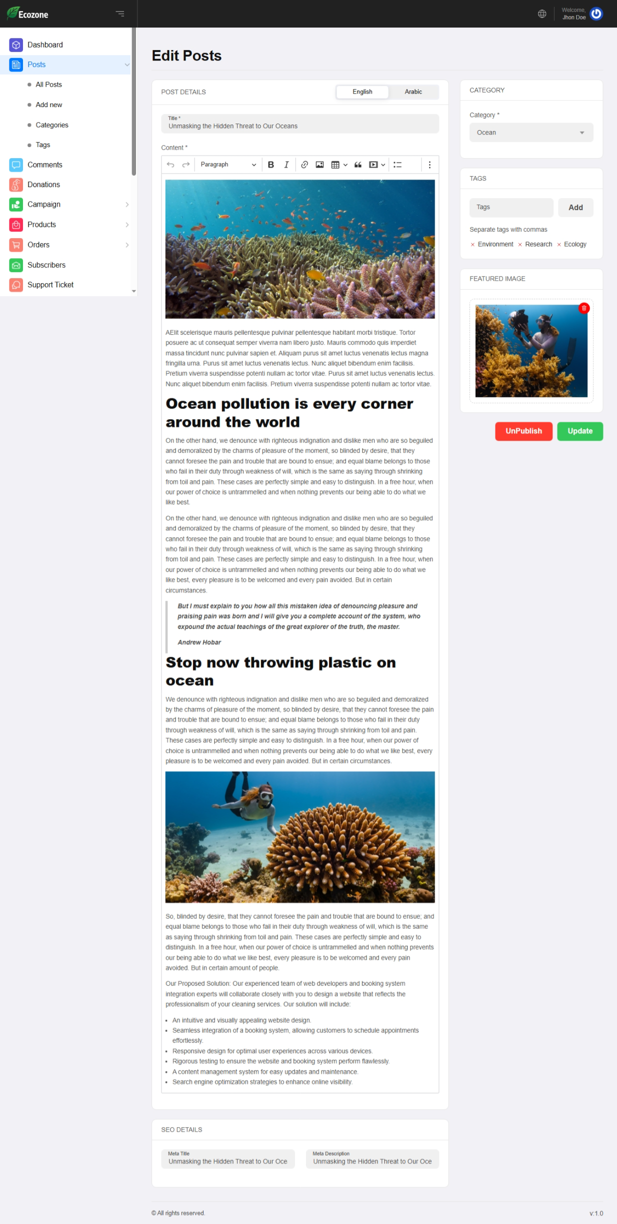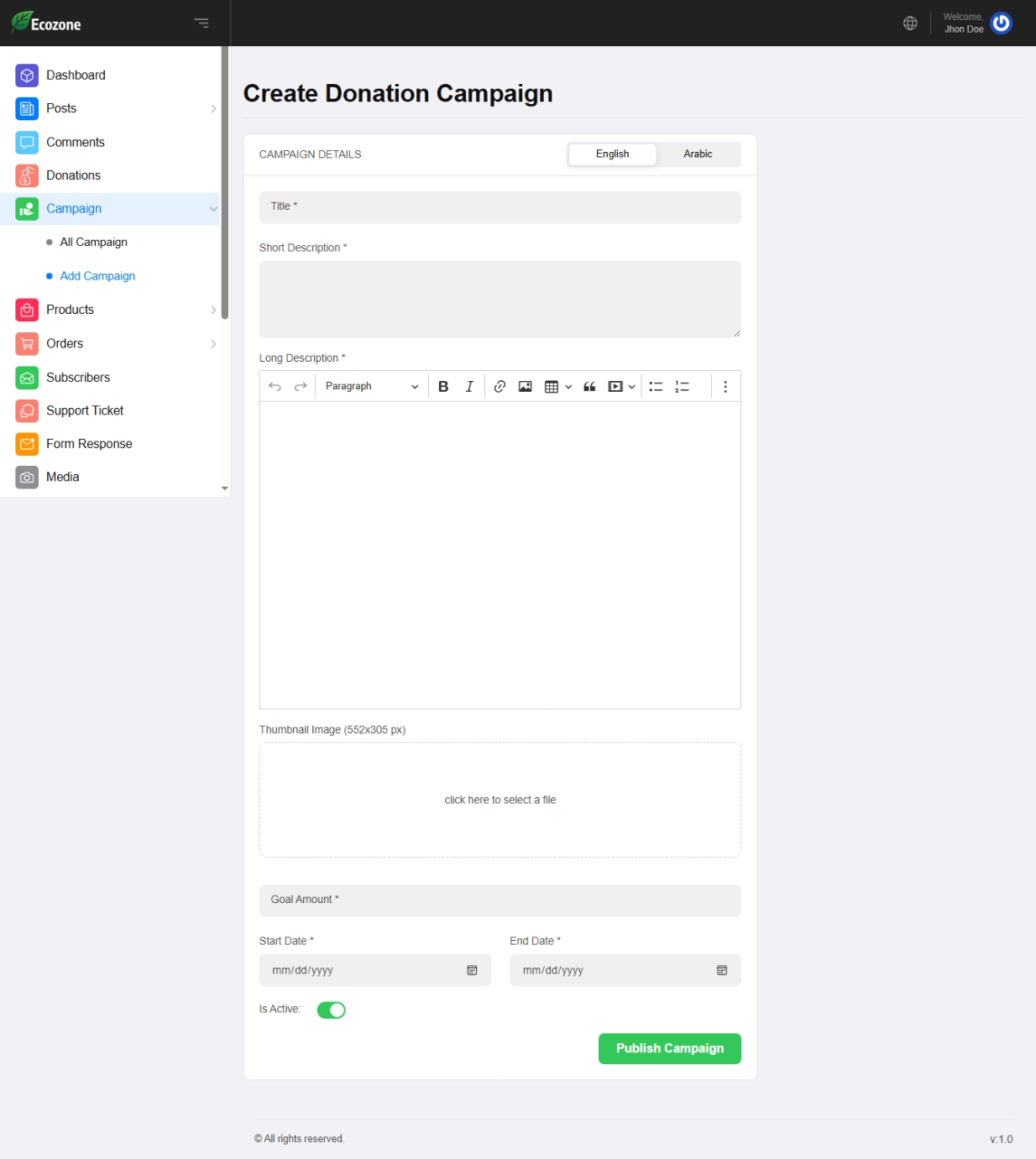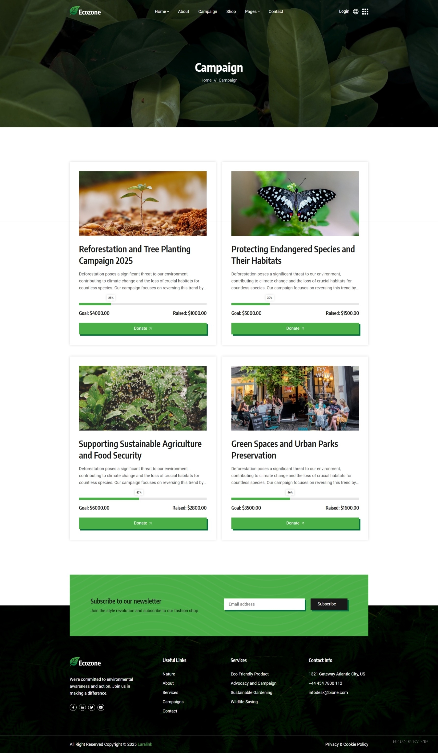 Campaigning Function – Ecozone also features an advanced campaign creation and management tool that allows you to launch, promote, and track environmental campaigns with ease. Organizations can create compelling campaign pages with rich media, detailed goals, progress indicators, deadlines, and call-to-action elements—all visually editable using the Live Page Builder. This feature empowers you to highlight climate initiatives, fundraising drives, conservation projects, and awareness programs in a professional and SEO-optimized format.