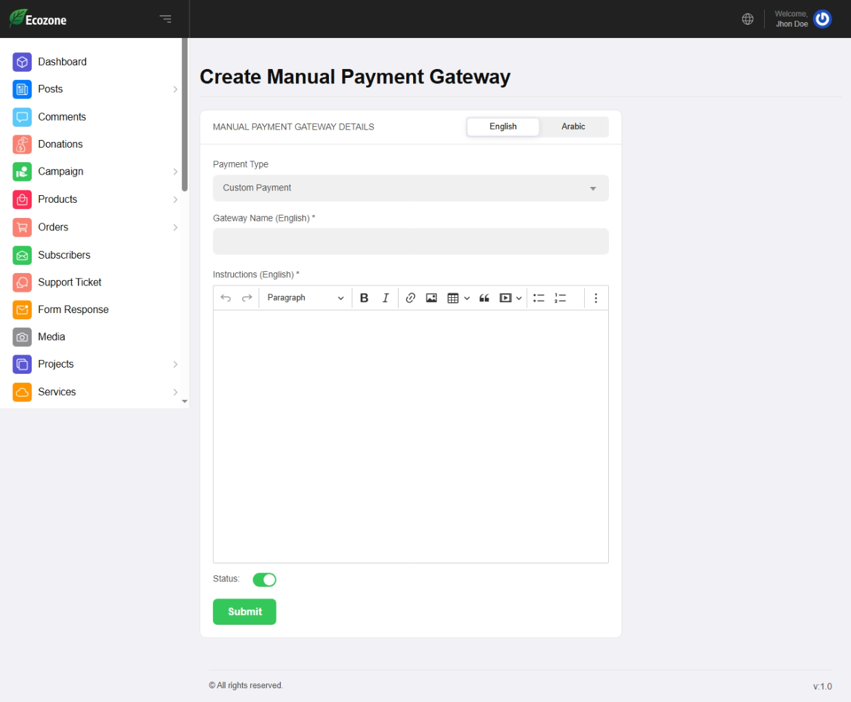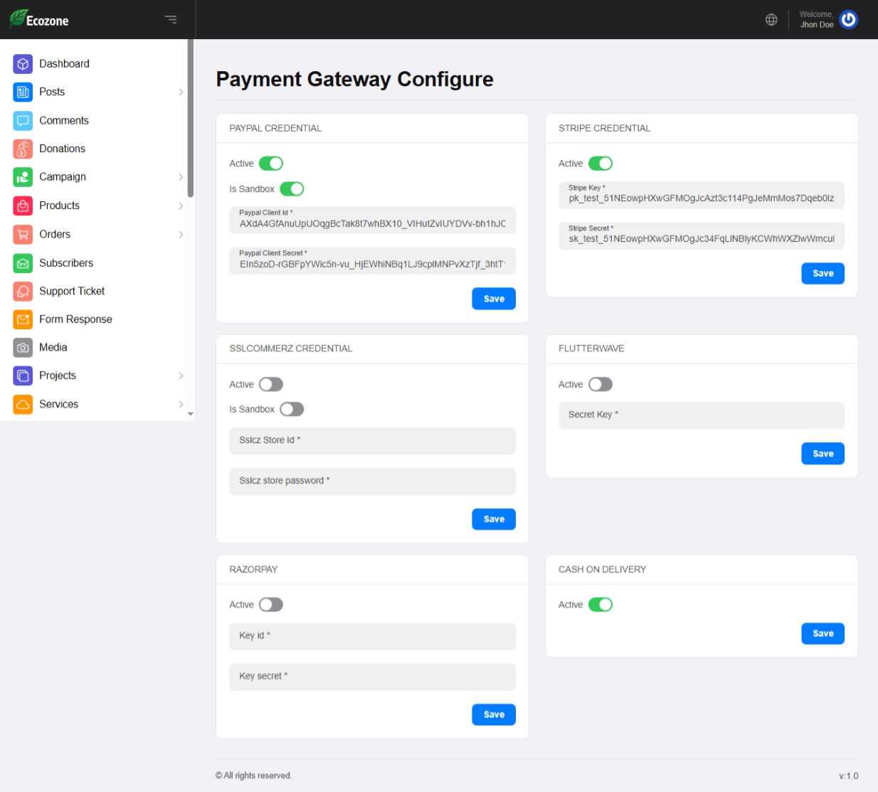 Payment Gateway – Ecozone support many payment methods like PayPal, Stripe, Razorpay, Flutterwave, SSLCommerz…