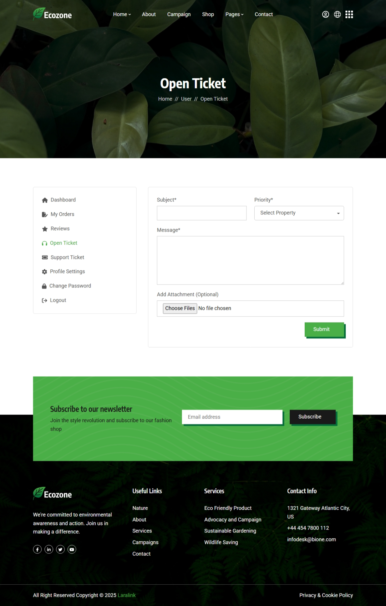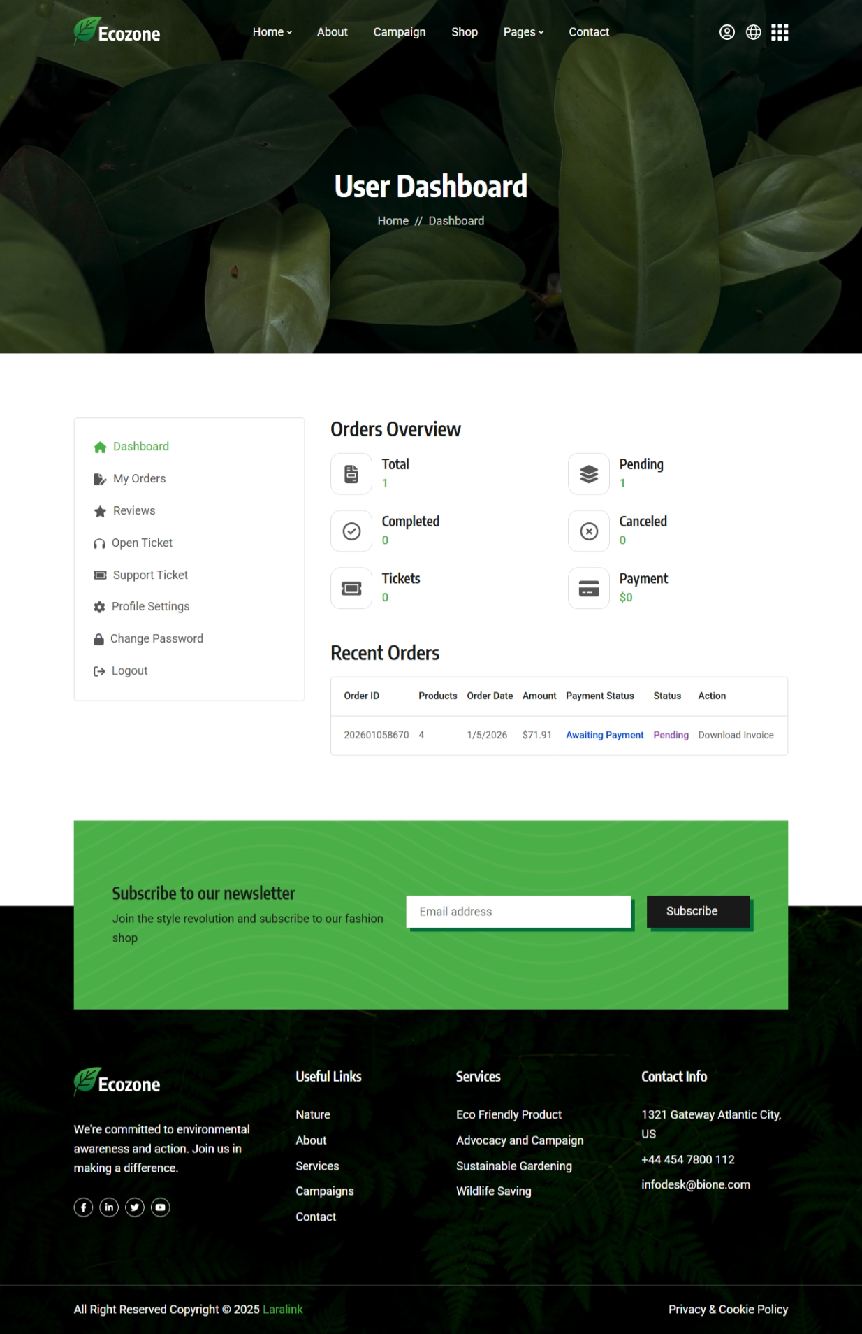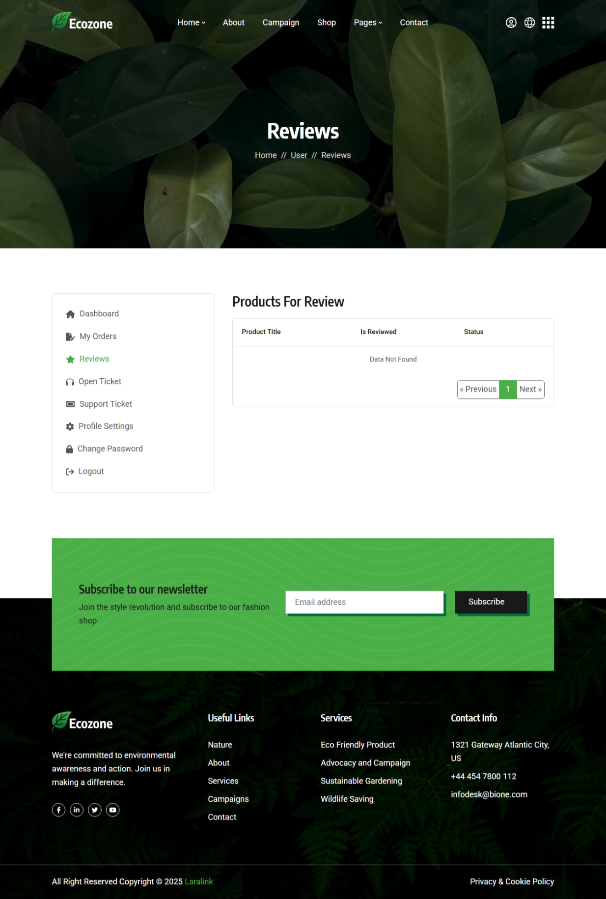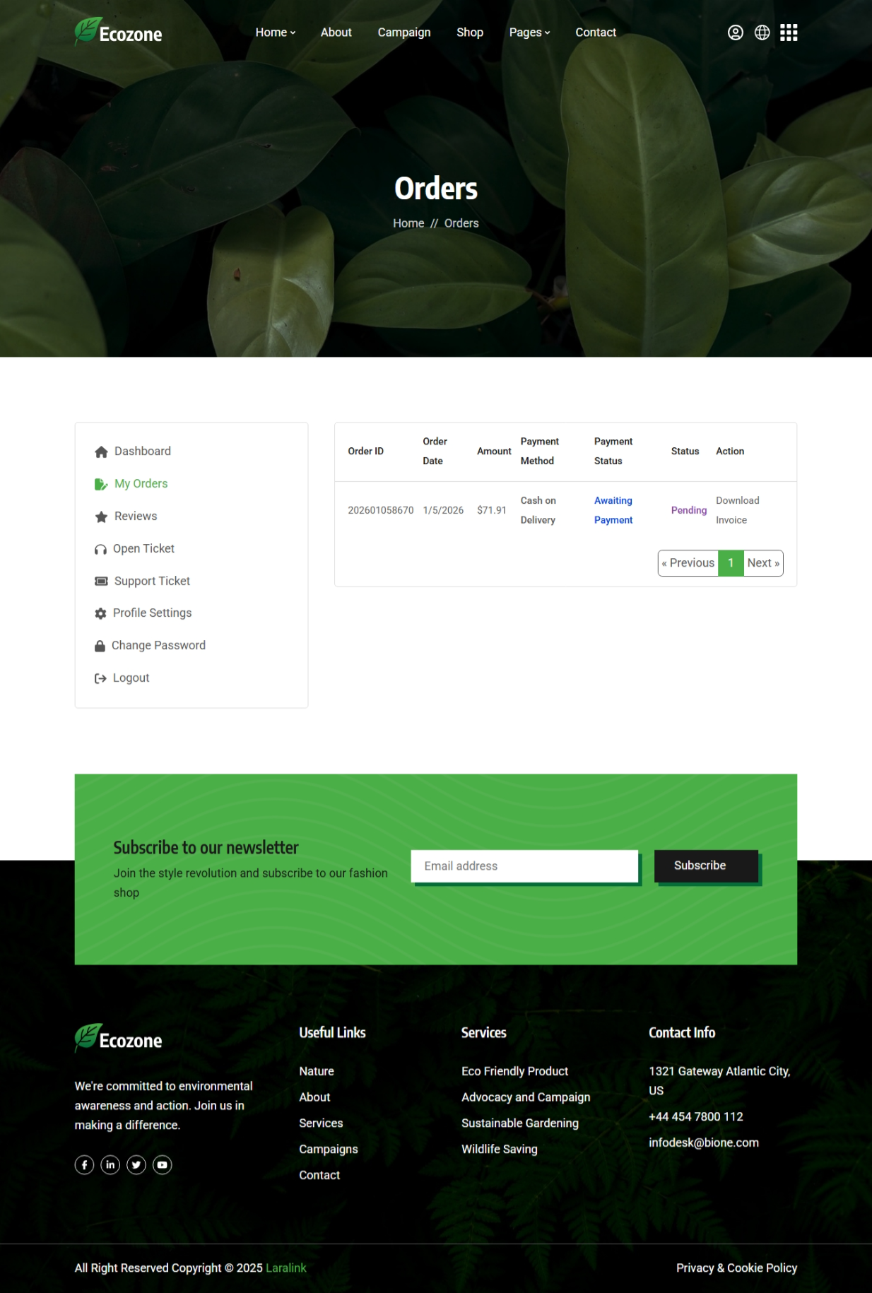 Welcome to the future of Ecology & Environment website! Our cutting-edge Ecology & Environment Laravel site is a powerhouse built with the latest technologies, including Laravel, React, MySQL and LaraBuilder live page builder. Designed specifically for Ecology, Environmental projects, Non-profit organizations, Nature, Animal, Recycling, Agriculture, Ocean Life, Charity, Donation, Campaigning, Climate Change, Green initiatives and much more.