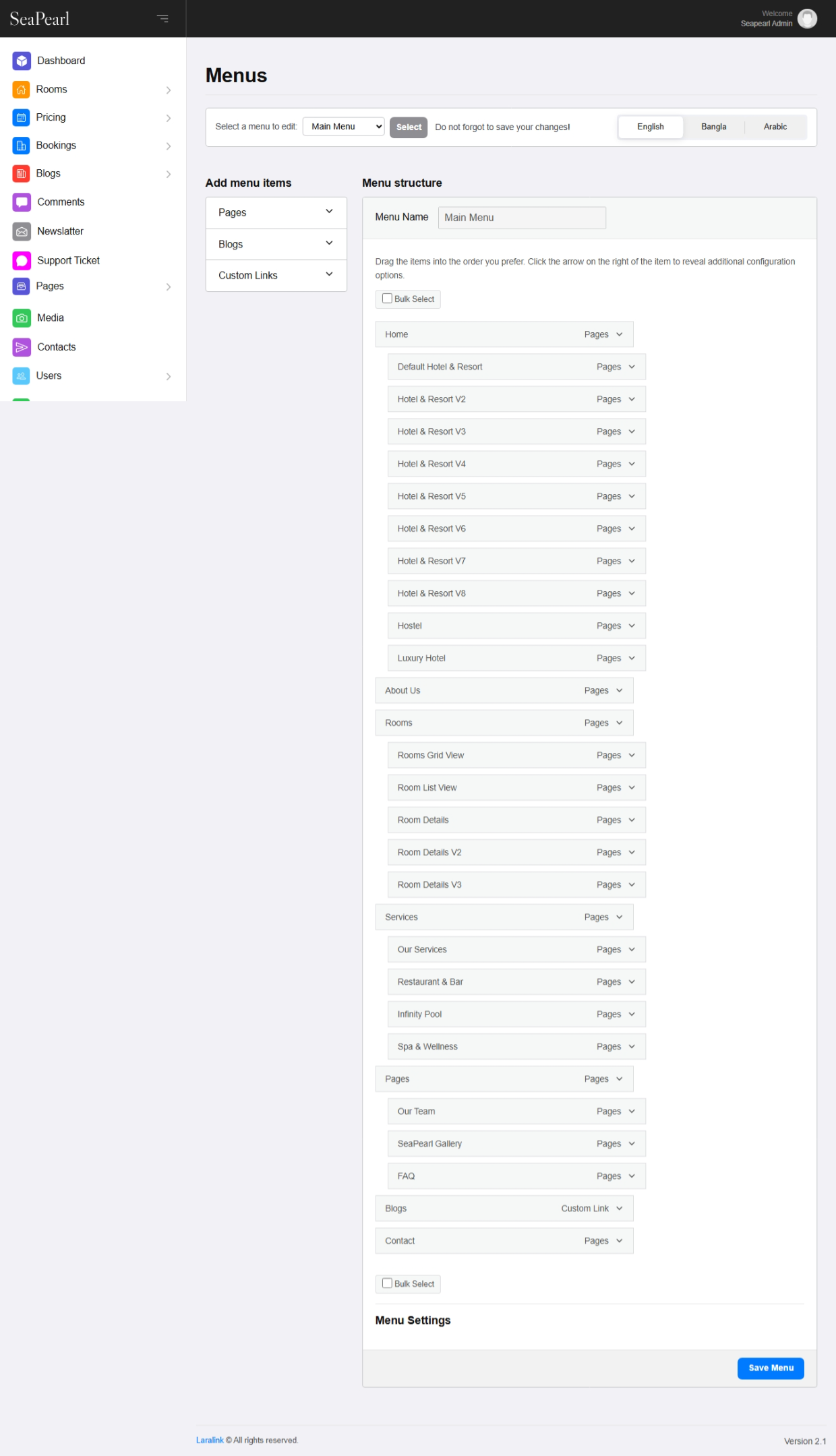 • Create/Edit/Delete Pages, Rooms, Services, Team, Testimonial, Posts etc